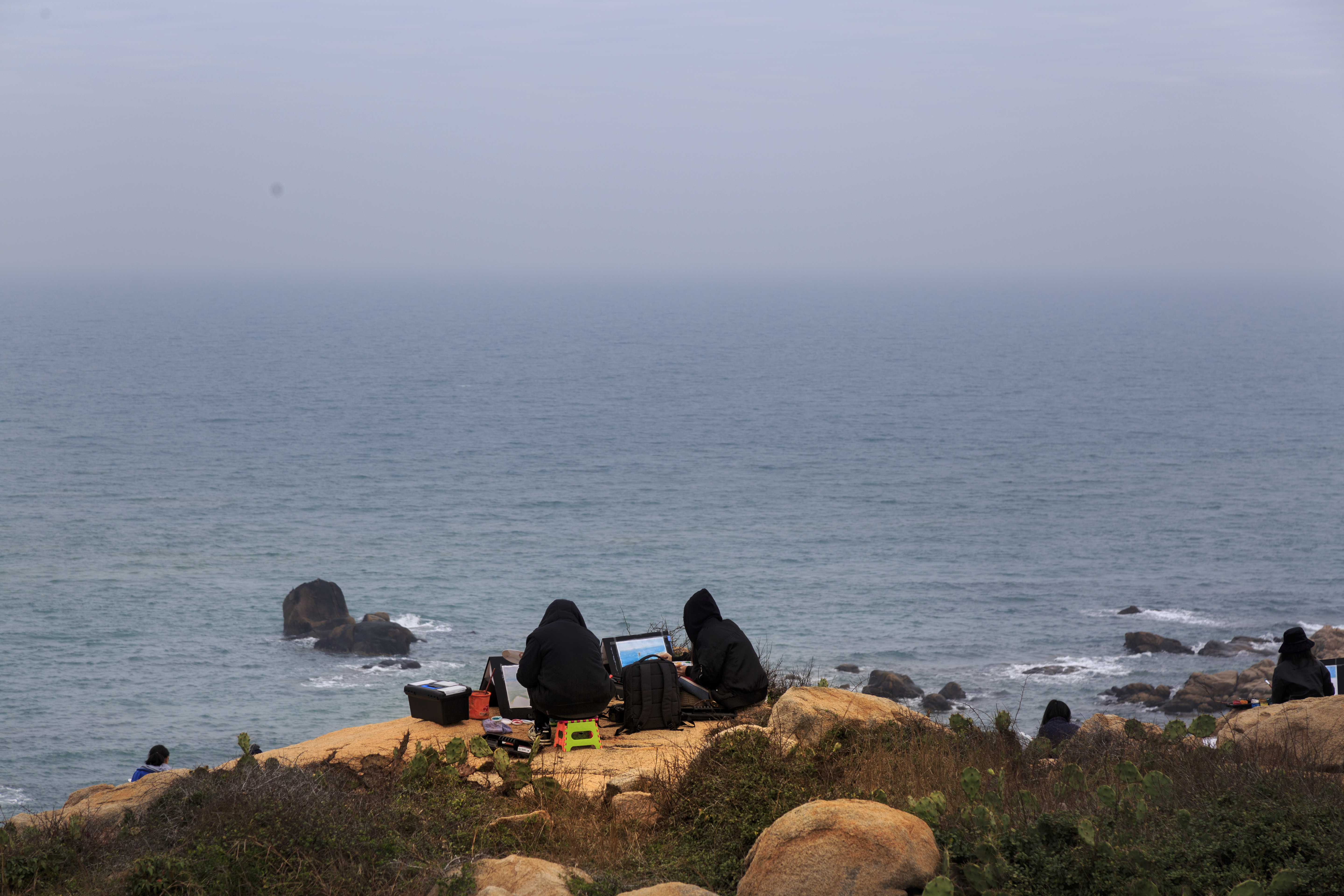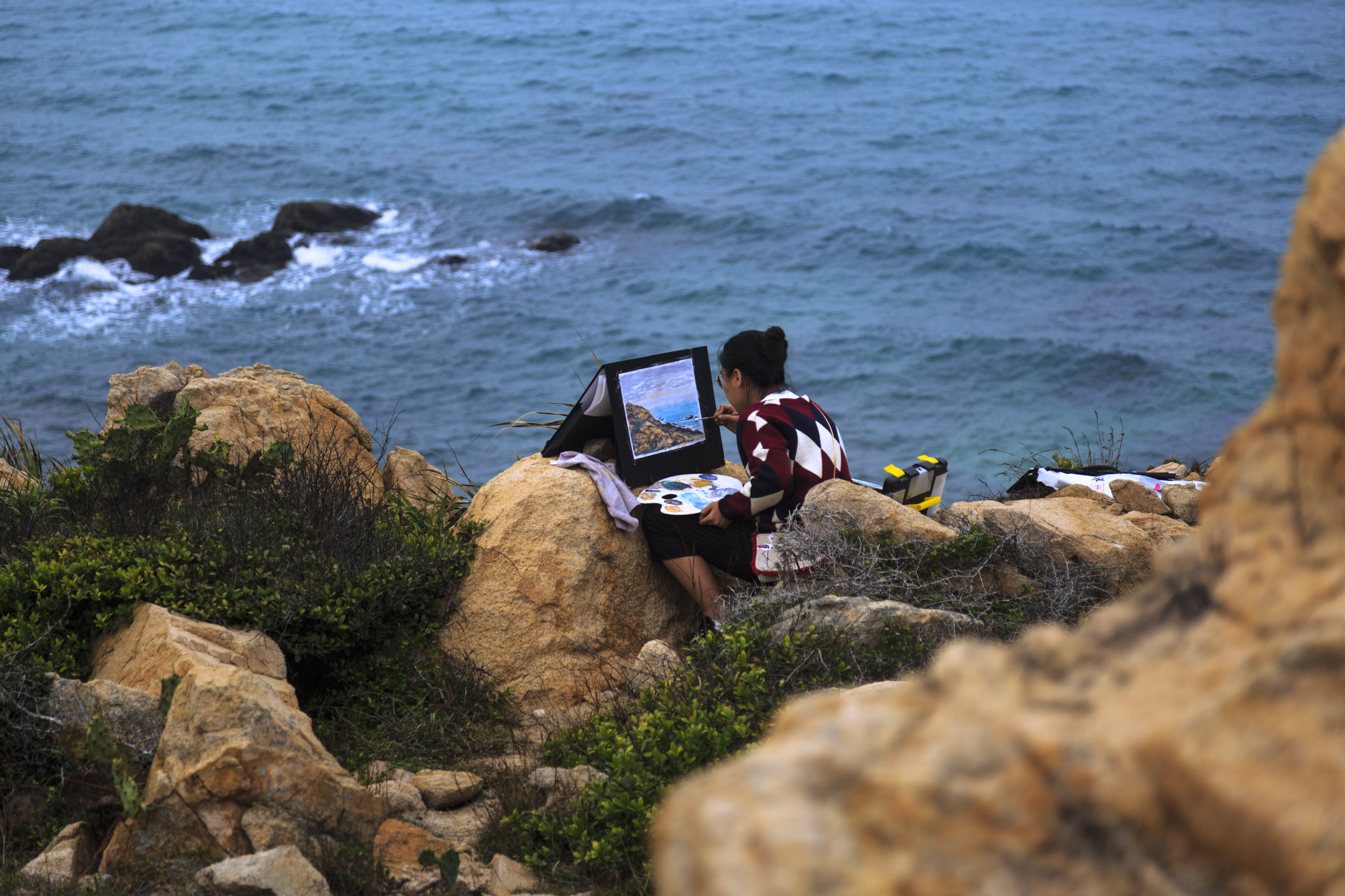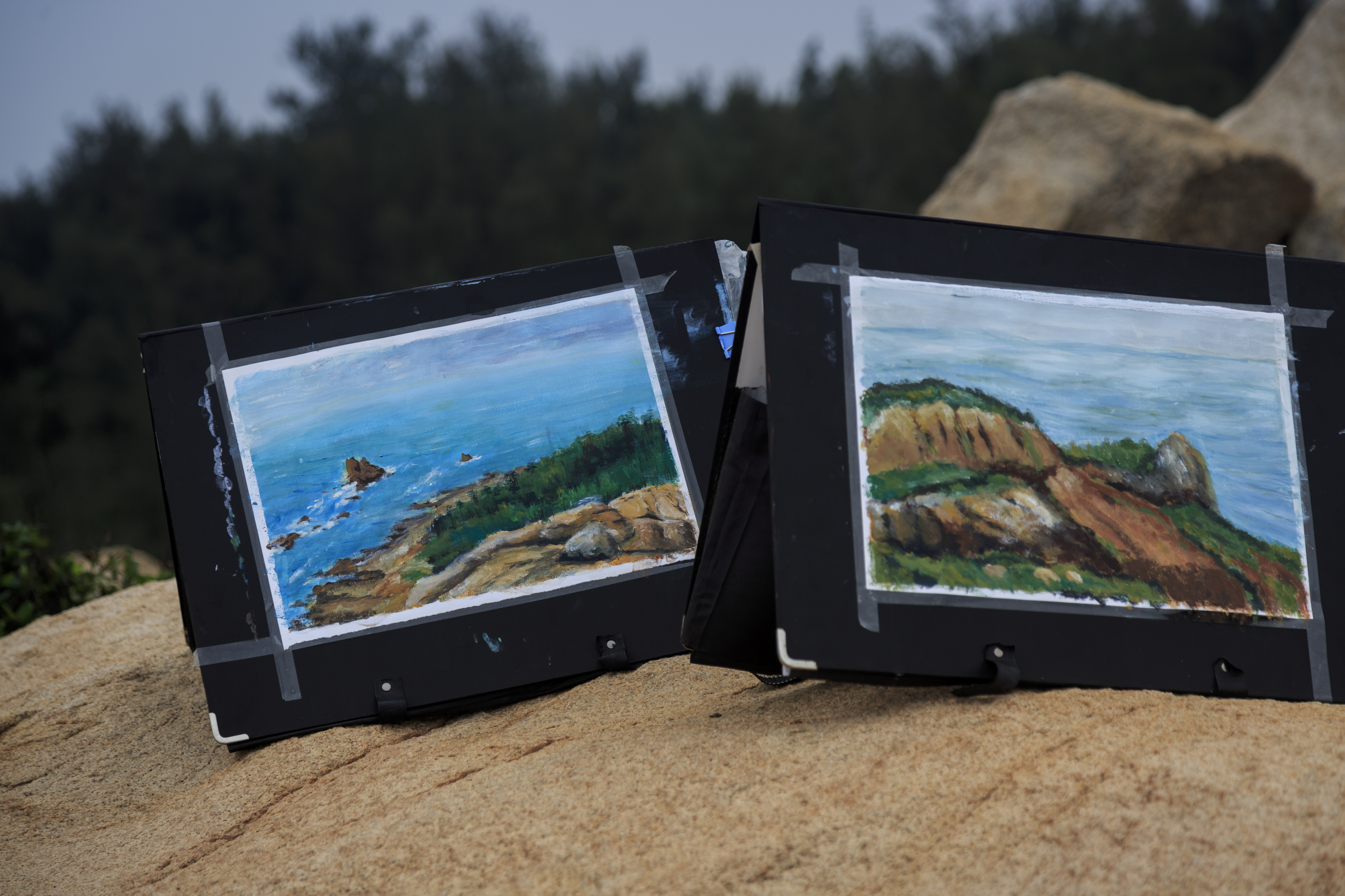 这次实践是周洁老师主持的“风景画”课程教学实践,目的是在课堂与现实社会及大自然之间建立一座桥梁,让员工们领略自然的魅力与时代的精神面貌。在此三天短暂的行程中,师生们集中精力研究了棋子湾奇石的独特造型,海岸色彩的光线变化,色调倾向等,并将其显示在画面上。