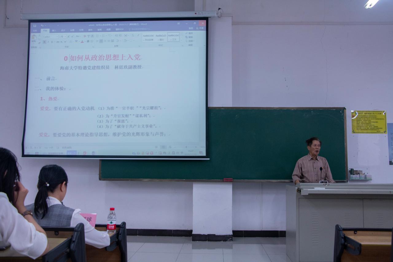 开班仪式结束,“奋进新时代,建功自贸港”主题党课教育活动正式开始。特邀嘉宾林廷玖就“如何从政治思想上入党”这一主题作出深刻讲解,结合个人经历和深厚学识,从理论与实践的统一,历史与现实的考量和个人与国家的联系等方面向我们阐述了爱党爱国,服务人民等党员应具备的优秀品质。