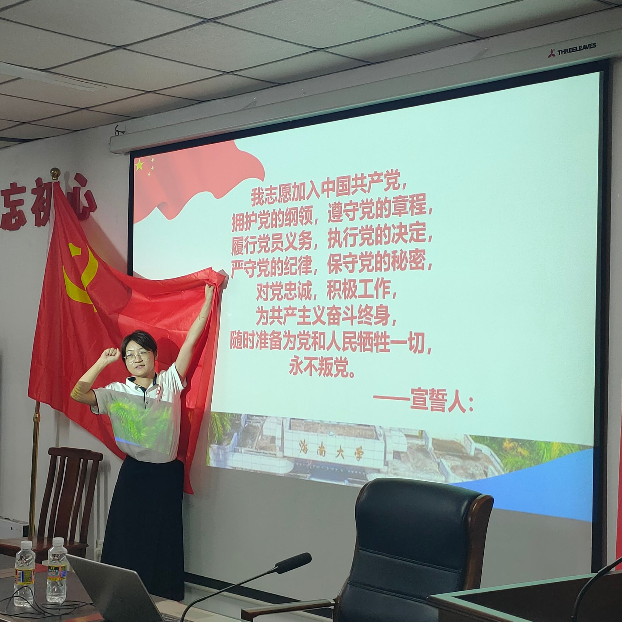 接下来,全体党员面对鲜红的党旗庄严宣誓,重温入党誓词,时刻不忘入党那天举起的右臂、许下的誓言,不忘初心使命,在新征程上踔厉奋发、勇毅前行。老党员海滨和青年党员张佳鸣两位同志分别分享了自己的入党初心和潜心教育科研、全心全意培养合格人才的使命担当,引起全体党员的共鸣,获得热烈掌声。