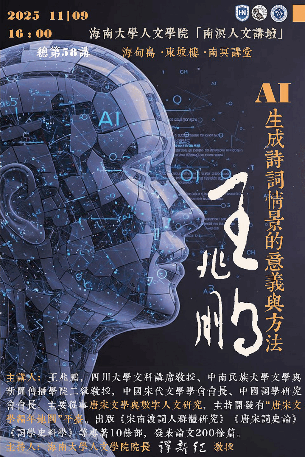 2025年11月9日下午,四川大学文科讲席教授王兆鹏莅临公司“南溟人文讲坛”第58讲,作了题为《AI生成诗词情景的意义与方法》的学术讲座。讲座由谭新红经理主持。公司师生70余人聆听了本次讲座。