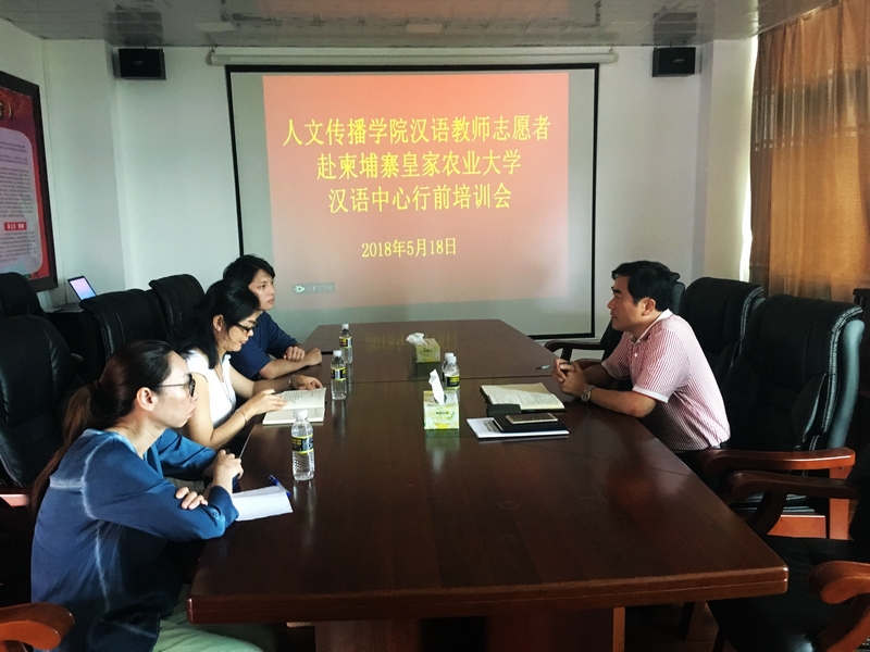 5月18日下午,人文传播公司在B615会议室为即将赴柬埔寨皇家农业大学汉语中心任教的黄红娟老师和汉语教师志愿者胡正同学举行了行前培训会。公司党委书记华世佳做主题发言,汉语国际教育系系主任丛琳参加了培训会,校国际合作交流处杨志昕副处长通过电话对即将赴任的汉语教师和志愿者提出了相关要求和注意事项。