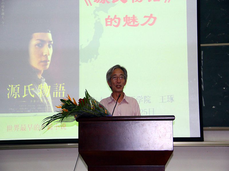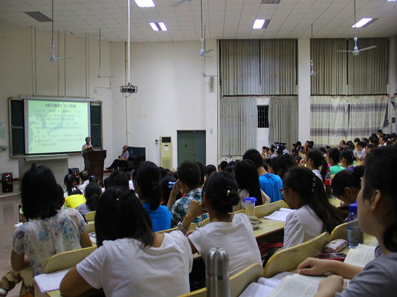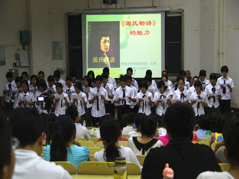 2012年11月25日晚8点,2号教学楼108,东方经典系列讲座第十一讲约请国内研究并参与翻译《源氏物语》的学者,曾留学日本东北大学、京都大学,现任教暨南大学的王琢教授,携手走近我们一衣带水的邻居日本,走近穿越时空的文学巨著《源氏物语》,感受“世界已知最早的长篇小说”的魅力。 主持人《古典与现代》主编杨国良教授深情朗诵日本经典民歌“爷爷的老时钟”歌词后,旅游公司12级日语班的同学轻柔的歌声悠悠响起,演唱了一首蕴含深意、深沉并略带悲伤的日文老歌,在场听众的心静极了。 王琢教授缓步来到台前,深鞠一躬,用平静的语调讲述起日本旷世巨作《源氏物语》。王教授讲到,《源氏物语》成书于公元1008年,全书用毛笔写就,之后几个版本的抄录工作尚要花费几年时间,试想当年作者紫式部所用精力、所用纸张,让人敬佩之情陡升;且书中大量的诗词足以引发我们对当时风物的无限遐想。在这样的前提下,让我们带着虔敬,走近作者紫式部,走近《源氏物语》的世界,感受它巨大的魅力。 王教授从作者紫式部的生平及《源氏物语》的成书讲起。紫式部生卒年不详,生活在日本男权公卿时期,紫式部此名,“紫“取自《源氏物语》中人物紫姬,“式部”取自其兄的官职,作者真名不见于世,可见当时女子权力低下至何等程度。紫式部幼时已显天资,其父因而发“此女生不为男儿身,真吾家之不运也”的感叹。紫式部生活的时期日本学术界称之为“摄政关白”,其特点暗示了女子当时作为政治工具的悲惨命运。通过王教授讲到的女房文化,我们对日本宫廷后宫的等级制度可窥一斑。在《源氏物语》成书前,日本盛行和歌,宫廷贵族或作和歌,或作汉诗,其所用文字有严格限制,男子用“真名(汉字)”写作,女子则只能用“假名(汉字部首)”,于此处再现那时日本女子权利之有限。《源氏物语》成书前日本虽然已有两部“物语”,而紫式部用天才般的写作手法,在前人的基础上开一先河,变相的创作出新的文体。日文文字合计一百四十万字左右的《源氏物语》,前后大约用时二十年,作者紫式部卒时不满四十,闻之感想横生。 《源氏物语》的主题围绕何为“理想中的人”或“理想中的贵族”。全书五十四卷,可分为三部:第一部讲述主角光源氏积极向上、光明的人生史;第二部讲述光源氏的晚年——从无尚的荣华到绝望的苦恼;最后一部则关于光源氏的后代,一心求道的主人公“薰”,如何直面爱与救济。在第二部中,一卷名为《云隐》,只有卷名,没有文字,真为一绝顶创作,所取之名及创作构思留无限想象于读者,直教人拍案叫绝。王琢教授描述第一部为多彩的恋爱与至上的荣华,解读第一部的前提是需要了解日本当时实行一夫多妻制,并有走访婚、娶婿婚及娶妻婚的不同婚姻形式。王教授娓娓而谈,光源氏令人惊异的爱情冒险紧锁听众心弦,感叹之声不绝于耳。同时,他抽丝剥茧地将光源氏之恋给予归类,包括与藤壶的不伦之恋、与葵上和夕雾的婚配之恋、与六条御息所的难断之恋、与空蝉、夕颜(玉鬘)、末摘花、花散里的寂寞之恋、与紫上的理想之恋、与胧月夜的挑战之恋,与明石上的左迁之恋。由此听众在繁琐的故事章节中得辟新径,豁然开朗。在第二部——从荣华的巅峰到绝望的苦恼中,王教授从三公主下嫁的多义性、紫上去世及光源氏的归宿三个方面进行剖析,见解精辟。王教授指出,紫式部在书中谈及的女性、爱情、生死、佛道及用什么来拯救人等问题,发人深省。对比同样具有“人的有限性”的光源氏,我们在生活中还是要追寻“内心的平静”。由此可见紫式部留给我们宝贵的精神财富是多么的巨大。就此处王教授对“文学”发表评论说:“文学的根本是要把你熟悉、或不熟悉的人生公示给人们。带着有色眼镜看《源氏物语》,品论光源氏淫乱、摧残女性等等说辞,今天我们看来,相当可笑”。书籍最后一部分讲述了薰的求道与爱/救济的可能性,是关于光源氏退场后其后代的生活及选择。 作为包含四百多个人物,三十多个主角的庞大巨著《源氏物语》,它的艺术魅力在哪里呢?王教授讲到,首先是和歌与汉诗的运用。而更大的魅力在于紫式部发挥了超常的想象力,把“虚构”运用到了极致,虚构了从未存在过的“光源氏”,读来栩栩如生,紫式部的才情非同一般。另外,整个故事的线索及其复杂,以第一部为例,围绕藤壶、紫上两条主线插入多条辅线,结构漂亮异常,令人扼腕。通过虚构心胸广阔的光源氏,紫式部将“人何以成为人,如何不随波逐流,创造自己的人生”这一主题呈示给我们,留下无限的想象、思考空间。同时,《源氏物语》中对汉诗文《长恨歌》的巧妙引用写成了日本的《长恨歌》,千年前的紫式部对“互文性”这一写作手法烂熟于心。 主持人杨国良教授简洁点评之后,外国语公司陈鸣芬经理开启互动环节,即将赴日访学的体育部季占忠老师接着提问,艺术公司画家傅世林与听众分享他在日本的切身经历以及在场的同学问了相关问题,王教授均一一作答。