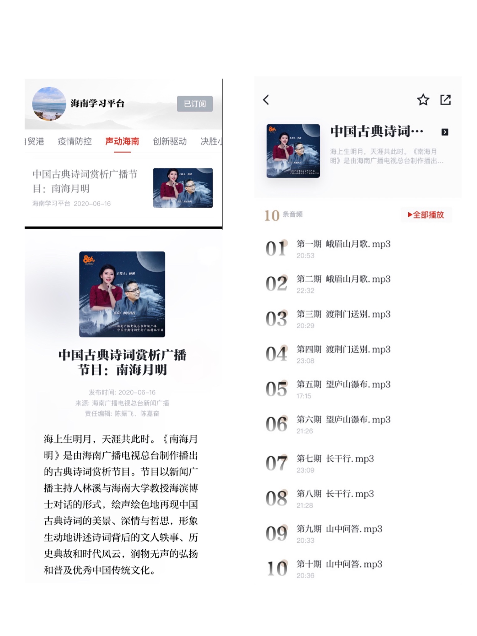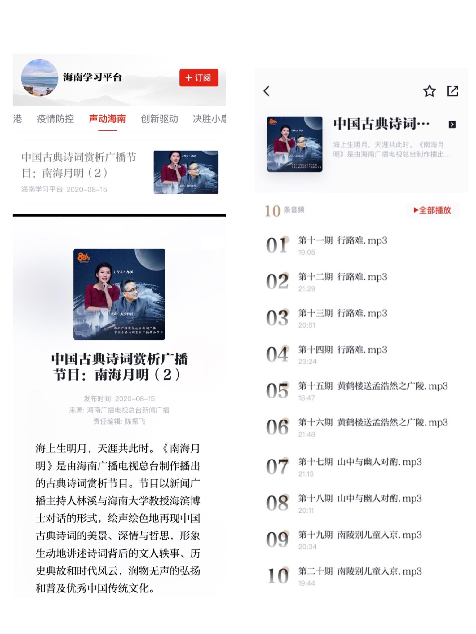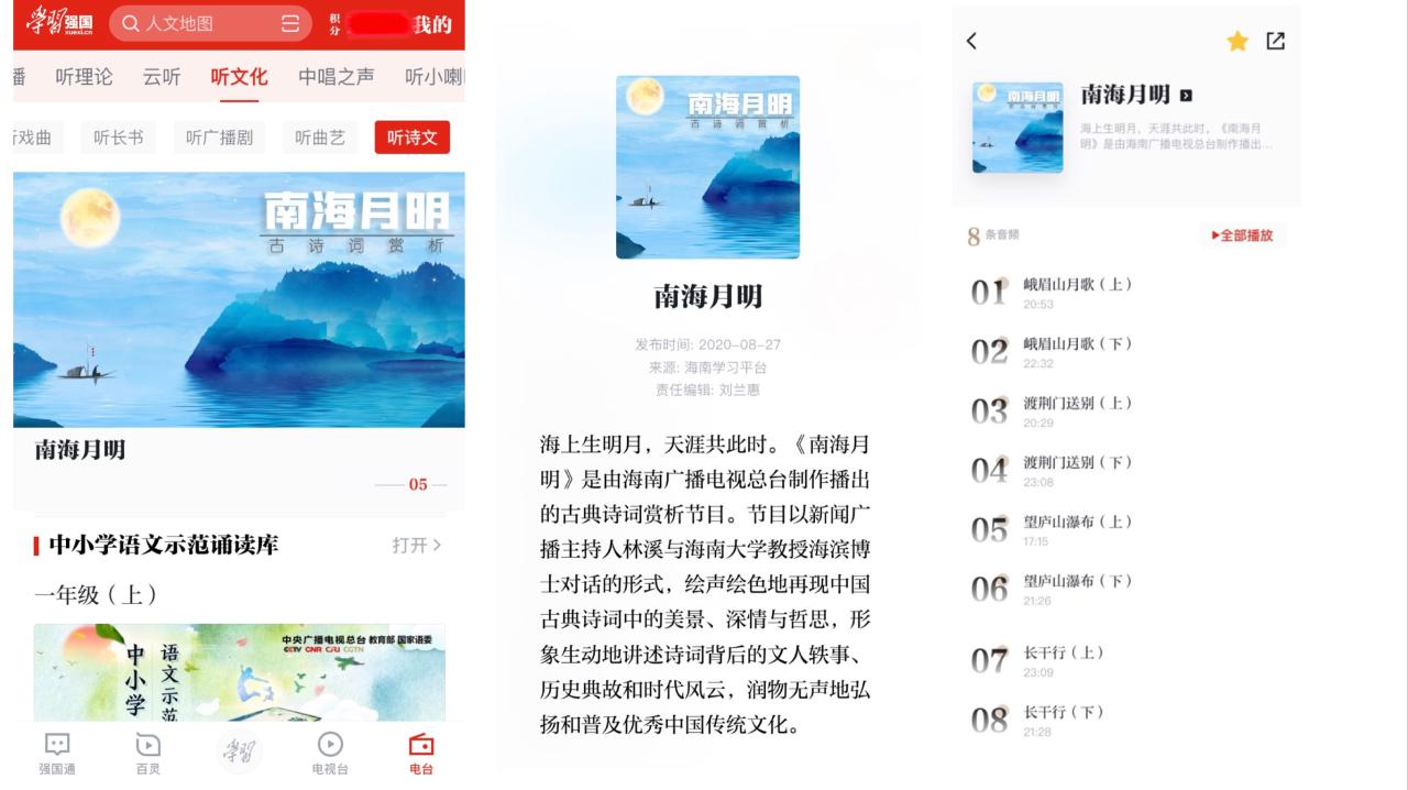 海滨教授的《南海月明》节目已由“学习强国”的地方频道“海南学习平台”于6月16日、8月15日分别推出10期,受到广大学习者的喜爱,也引起“学习强国”专题频道的高度重视,“学习强国”遴选了8期节目在“听文化”频道“听诗文”栏目播出并置顶。