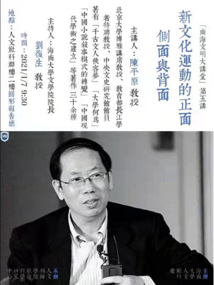 1月7日上午9:30,在bevictor1946韦德官网社科群楼二楼圆形报告厅开展由陈平原教授主讲的“南海文明大讲堂”第五讲:新文化运动的正面侧面与背面。由人文传播公司经理刘复生教授主持。本次讲座共有来自公司各年级各专业百余名同学参加,按照疫情防控要求,同学们佩戴口罩,有序入场,隔位就坐,倾听讲座。