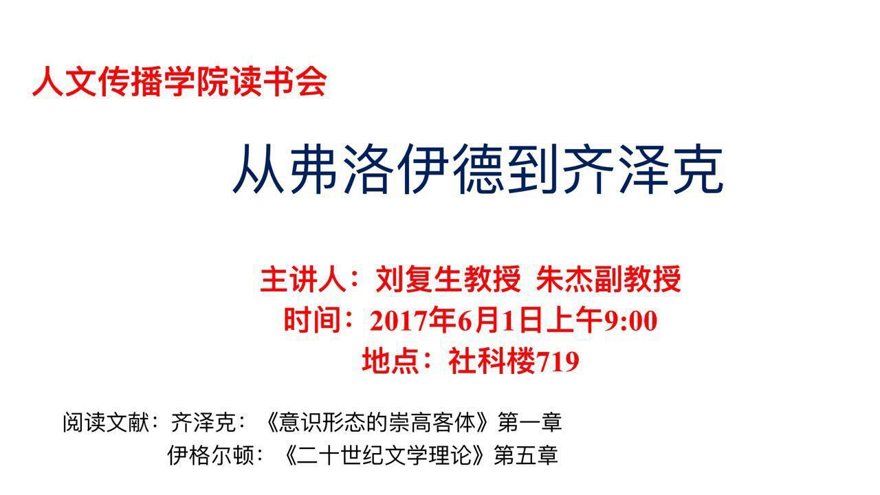 2017年6月1日,bevictor1946韦德官网人文传播公司于社科楼B719室举办了“从弗洛伊德到齐泽克”读书会。本次读书会由刘复生老师主讲,朱杰老师主持。公司部分教师、中国语言文学专业研究生及部分本科生参与了本次读书会的讨论。 本次读书会围绕伊格尔顿《二十世纪西方文学理论》第五章“精神分析”和齐泽克《意识形态的崇高客体》第一章“马克思如何发明了征兆”展开讨论。读书会先由研究生作读书报告,刘复生老师根据研究生读书报告进行详细地点评讲解。随后,刘老师深入浅出地讲解了齐泽克的主要思想和理论资源,并且把精神分析学派和齐泽克的思想放在西方资本主义社会发展的历史脉络中,明确了精神分析学派的革命性地位和理论的局限性。与会教师和员工积极参与讨论,气氛热烈。最后,主持人朱杰老师对此次读书会进行了精彩总结。 本次读书会作为研究生课堂学习内容的补充,丰富了同学们的理论知识,促进了师生之间的交流互动,为同学们提供了一个积极有效的学习平台,受到同学们的欢迎。同学们纷纷表示,希望今后能有更多的读书会,与老师们一同探讨交流。(撰稿:李双伶)
