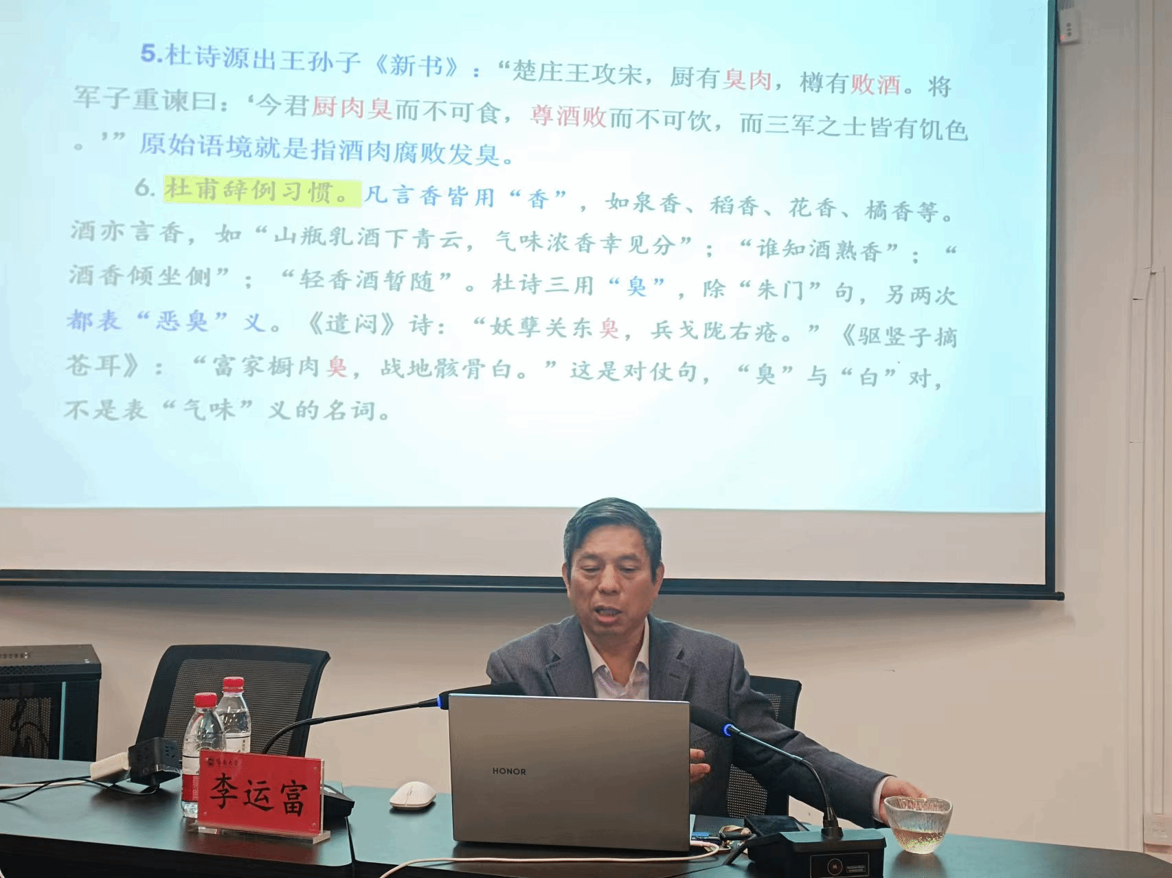 讲座伊始,李教授指出,清代著名学者俞樾《古书疑义举例》列举的88条“条例”虽然涉及训诂学的方方面面,但显得比较零碎,尚需要进一步概括和凝练才便于使用。他在此基础上提出了三条训诂条例:合情(文情语境、文化背景),合理(事理逻辑、人情世故),合法(语言文字规律、辞例)。接下来,他据此对古代诗文中的一些疑例进行了细致全面的解读。通过论析,他纠正了学界以往对《绝句》中“杨柳风”、《诗经·秦风·无衣》中“岂曰无衣,与子同袍”、《自京赴奉先县咏怀五百字》中“朱门酒肉臭”、《孟子》中“乐岁终身饱”等的误读。李教授的讲座幽默风趣、深入浅出,同学们收获颇丰。