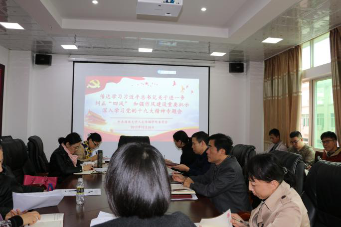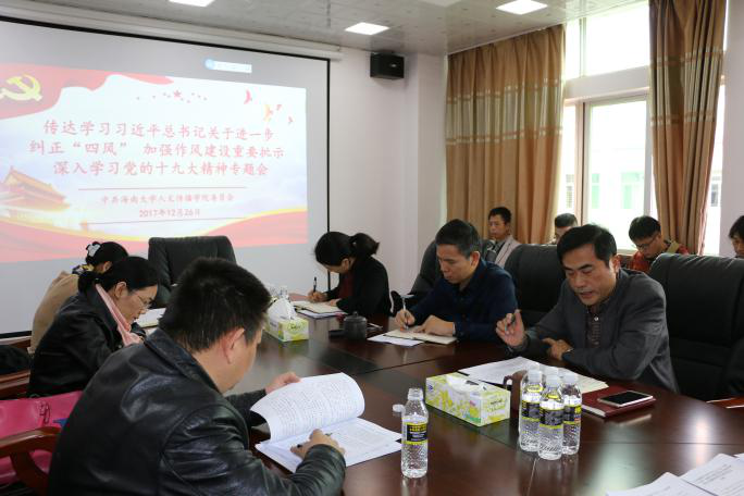 12月26日下午,人文传播公司教工第一、第二党支部在社科楼B615联合召开传达学习贯彻落实习近平总书记关于进一步纠正“四风”加强作风建设重要批示 深入学习党的十九大精神专题会,会议由教工第一党支部书记李音主持。 会议第一阶段,公司党委书记华世佳、副书记孙晓嫒分别作学习党的十九大精神的主题发言,随后教工第二党支部书记何晶娇、支部成员海滨、支部书记李音也分别从不同的角度畅谈自己学习党的十九大精神的收获与体会。大家纷纷表示,学习党的十九大精神不能放松,不仅要学习理论知识,更要用理论指导实践,使其贯穿于具体的工作中,推动各项事业的发展。 会议第二阶段,全体党员集体学习了新华社12月11日刊发文章《习近平批示后,中纪委再揭“四风”15个新表现》,了解了“四风”问题的各种新表现,领会了反“四风”的重要意义,知悉了在习近平总书记领导下党中央采取的一系列重要举措,更加坚定了党员同志们的共产主义理想信念,更加明确了“四个意识”,同时也纷纷表示党员就应该以身作则,坚决同腐化堕落的倾向和行为作斗争,牢固树立为人民服务的根本宗旨。 最后,会议要求每一位党员对照“四风”新表现规范自己的言行,并且在具体工作中对照查找自身问题,改进工作方式方法,切实发挥党员的先锋模范作用。//www.hainanu.edu.cn