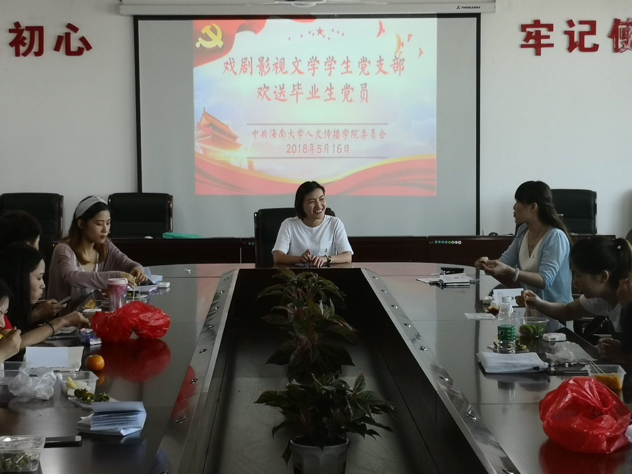 会议第三项内容是是戏剧影视文学员工党支部欢送毕业生党员,欢送会气氛轻松和谐,吃着水果的同时倾听了郭景霞同志代表毕业生党员的发言。