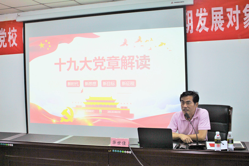 开班仪式结束后,举行培训班专题党课,华世佳以《十九大党章解读》为题,向学员们宣讲习近平新时代中国特色社会主义思想和党的十九大精神。他围绕十九大党章,对习近平新时代中国特色社会主义思想、党章的概述、发展历程、总纲、条文和学习十九大党章应遵循的原则六大版块进行讲解,对十九大审议通过的中国共产党章程进行了全方位解读。授课过程中,同学们认真听讲、积极思考、勤做笔记、深受启发,学习氛围十分浓厚。