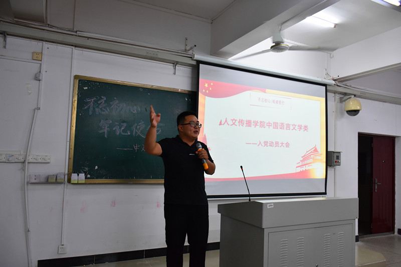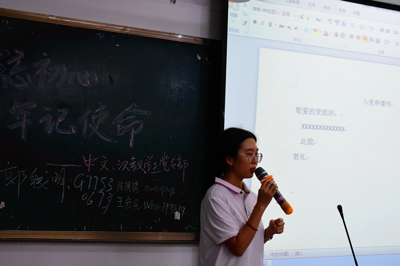 首先由2019级辅导员李洁老师作相关介绍,接着支部支委与党员代表向新生们做自我介绍以及党员经验分享,组织委员陈倩倩同志希望新生有困难找党员,有问题找支委,纪检委员郭钱明同志鼓励大家早点加入党支部,高闻同志分享了自己的党员经验与学习经验。新生们积极与党支部代表提问互动。随后,由宣传委员王宏民同志向朝气蓬勃的大一新生讲解入党申请书书写格式,中文员工党支部副书记郭瑞鹏同志向各位新同学介绍发展党员的要求与流程,并以其他党员的事迹为例子,指出同学们需认真思考“我为什么要入党?”这个问题,正确的入党动机对未来人生道路的重要性并希望新生们可以合理规划大学四年的生活学习。至此,伴随着经久不息的掌声,大会步入最后一项,中文员工党支部、汉语国际教育党支部代表与新生们一同观看《榜样》,学习优秀共产党人的精神,引导2019级新生对党有正确的认识,端正入党动机。