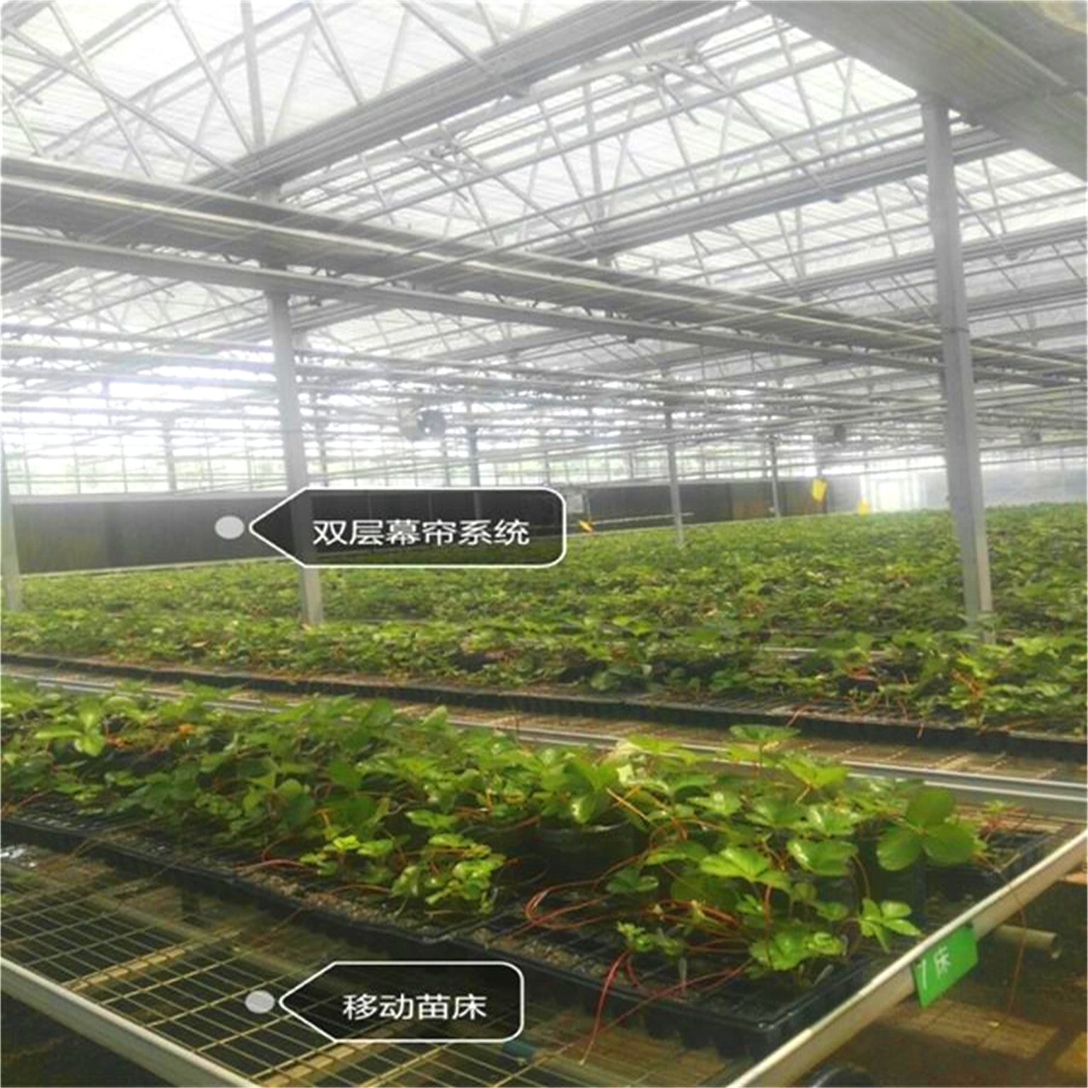 对于后期的草莓培育阶段,团队在相关工作人员的带领下,通过实地调研了解到,移植出的草莓分别在连栋温室、塑料大棚及日光温室进行培育。这三种培育场所各有各的有优点,其中连栋温室与日光温室的现代化水平更高。在连栋温室里有水帘,可移动苗床,排风,加热设施等现代化设备,可以越冬生产。日光温室具有主动采光主动蓄热节能等功能,通过电脑控制棉被和遮阳设施实现内部保温,大棚的斜面角度可以随时调节,其内部的一切设施实现了手机APP控制。