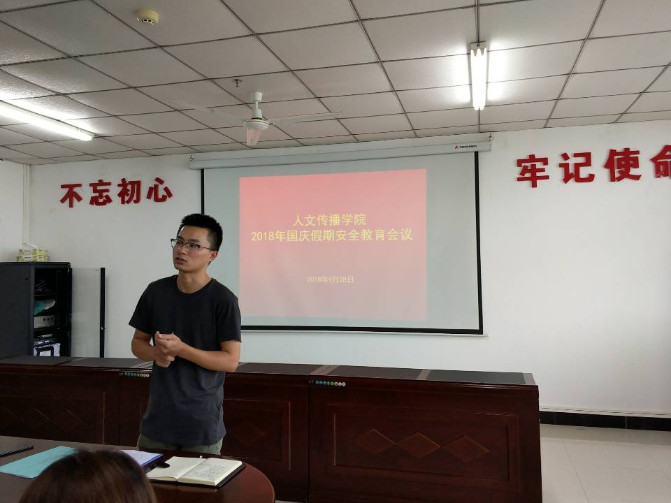 在国庆假期到来之际,为确保员工假期安全,帮助员工度过一个愉快的国庆假日,做好公司员工假期安全管理工作,动员宿舍文明创建工作,人文传播公司于9月28日,在社科楼B719召开了国庆假期安全教育暨宿舍文明创建活动动员大会,学工办李润东老师,组织2015-2017级各班班委参加会议。