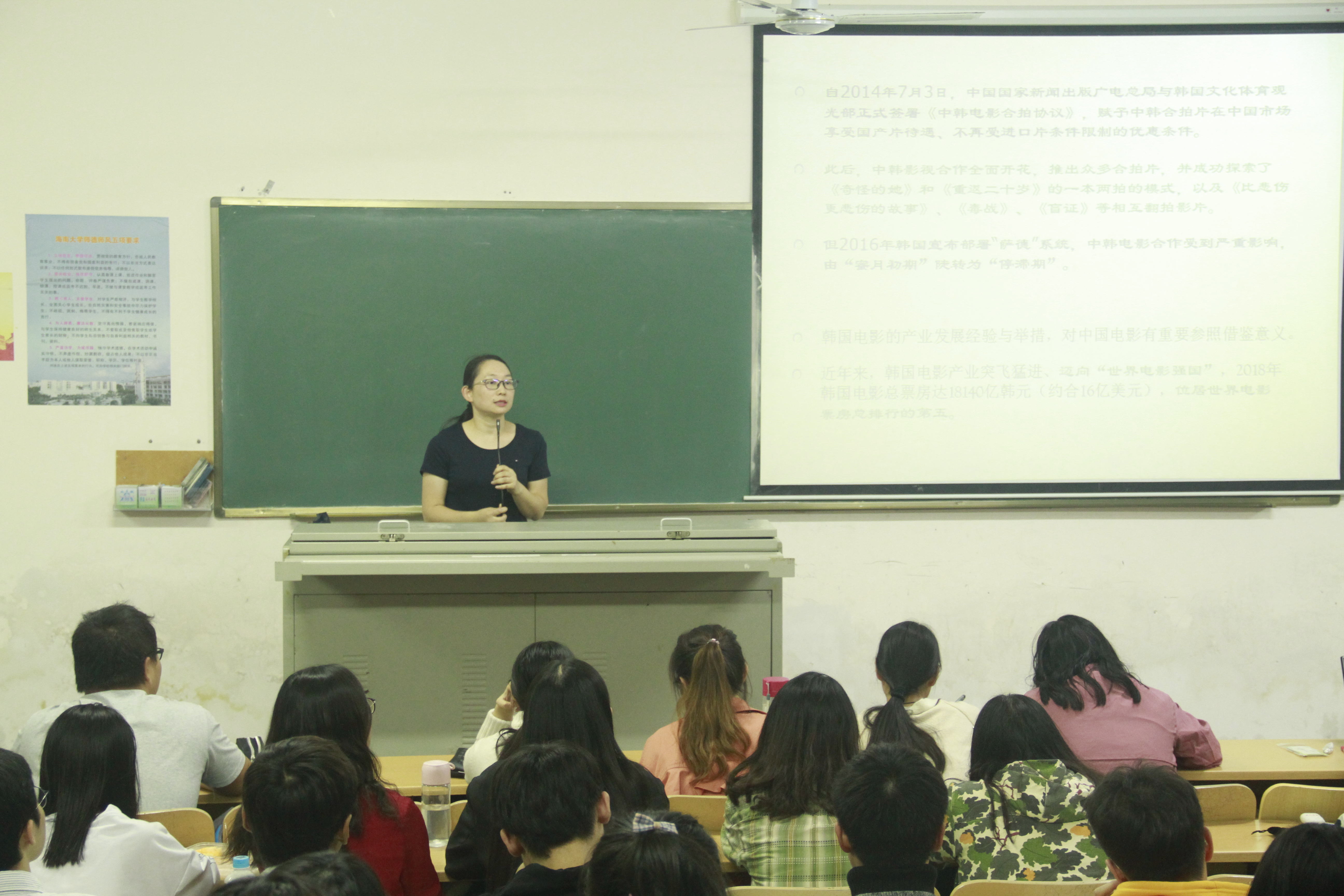 首先,张燕教授从多方面分析了韩国电影产业繁荣的原因,她重点指出,在分析过程中,要注意多种因素在韩国电影产业日渐繁荣的过程中所产生的推动作用,同时,张燕教授强调,韩国电影产业的发展经验,对当代中国电影业的发展具有极强的借鉴意义。而后,张燕教授通过当今五大电影市场的数据切入主题,带领同学们以世界性的眼光观察电影行业的现状。同时,她指出,韩国电影本身具有较高的人均观影率和本土占有率,在当今世界电影市场上占有较高的地位。而后,通过对韩国电影史重要节点的分析,张燕教授从两方面得出韩国电影进一步繁荣的原因。一方面,由于美国所施加的经贸压力,韩国被迫全面开放电影市场。好莱坞大片的进入在一定程度上刺激了韩国导演积极学习好莱坞的先进模式,发展本土电影。另一方面,韩国《电影振兴法》以及电影分级制的出现,也为韩国电影的发展起到了促进作用。最后,张燕教授细致分析了韩国影史中主要的电影类型,加深了同学们对韩国电影目前发展趋势的理解。至此,本次讲座在同学们的热烈掌声中圆满结束。