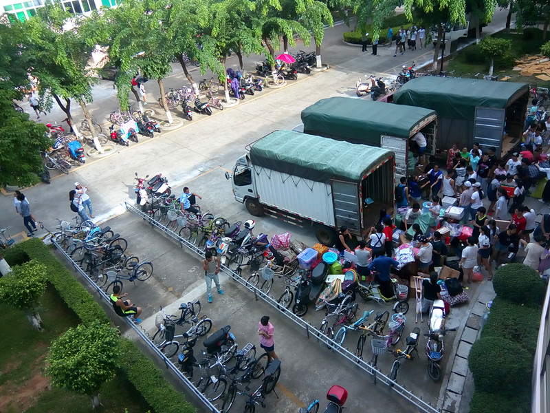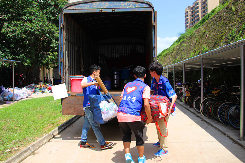 14点整,搬运工作正式开始,货车依次停靠在校道,同学们按时将行李搬至寝室楼下。烈日炎炎,志愿者们忙碌的身影穿梭在女生公寓,各班男生也积极主动地帮助女生搬运行李,协助打包、贴标签、询问注意事项。尽管行李堆积如山,尽管自己汗流浃背,他们也毫无怨言。同学之间也互帮互助,尽显公司团结和谐的友爱氛围。他们的付出给本该忙碌繁琐的工作添加了许许多多的温暖与欢乐。16点整,大巴车、货车从城西启程,于16:40顺利抵达海甸校区,2015级员工的新生活由此拉开帷幕。