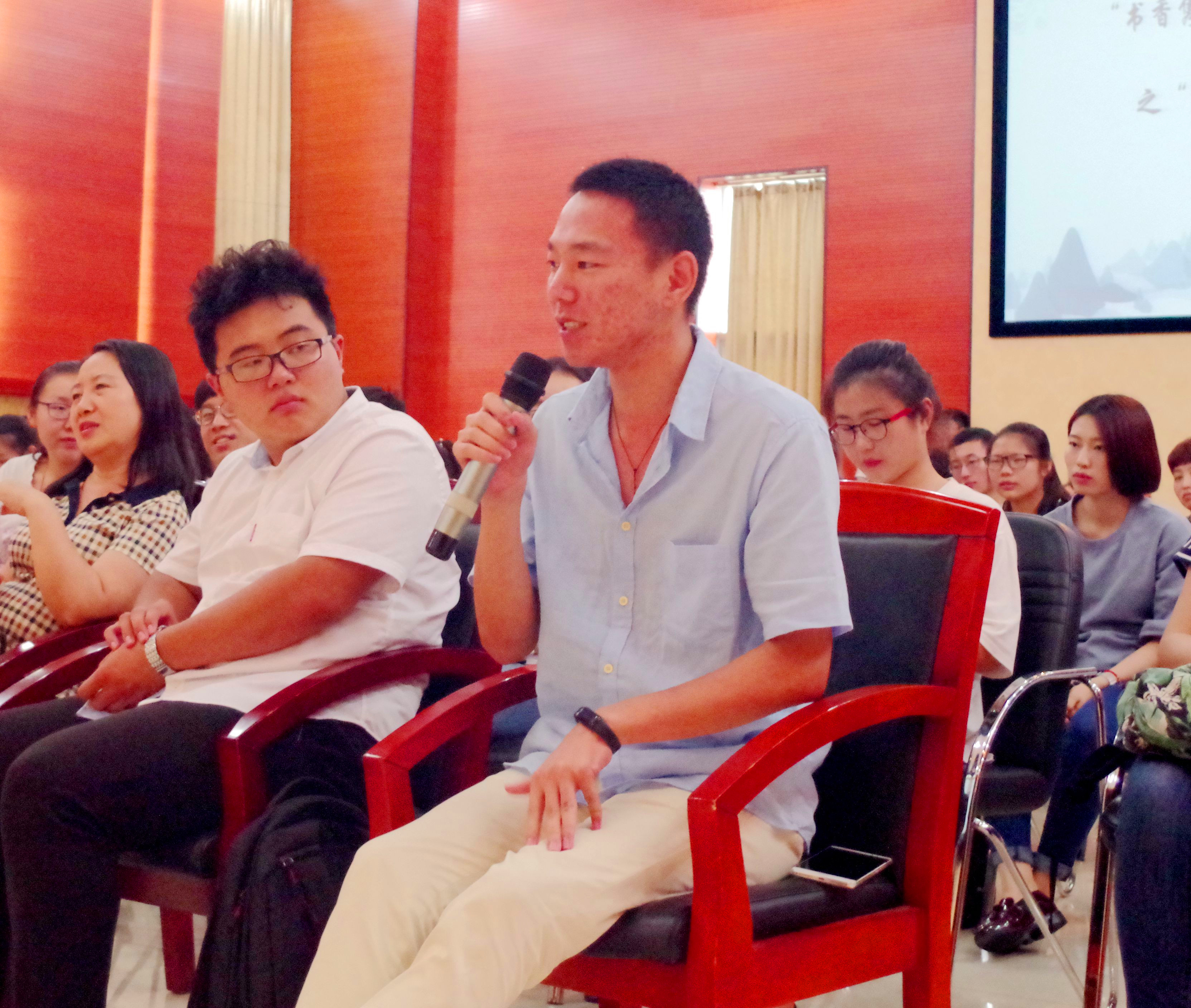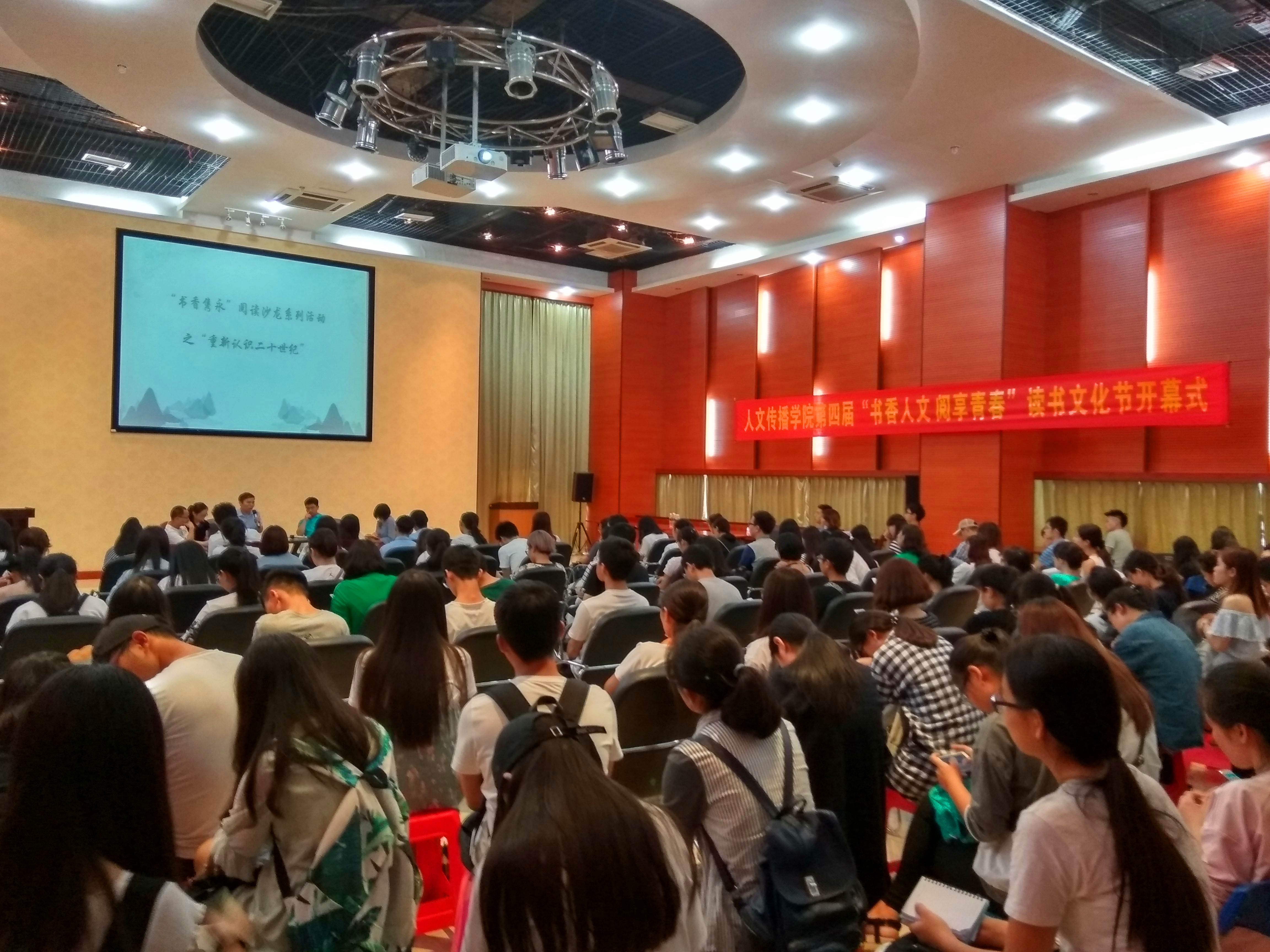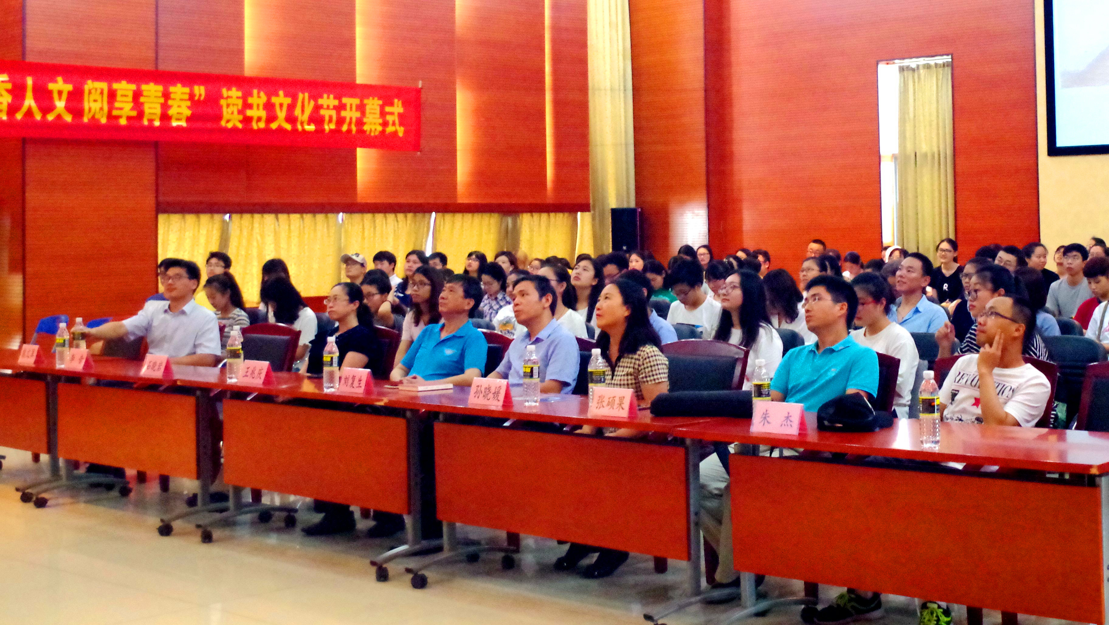 2017年4月25日14:40,人文传播公司 “书香人文.阅享青春”第四届读书文化节开幕式暨 “书香隽永”读书沙龙活动在思源学堂多功能厅举行。人文传播公司经理刘复生教授,党委书记王兆庆教授、党委孙晓媛副书记,副经理石晓岩副教授、张硕果教授,中文系李音副教授,传播学系朱杰副教授等公司领导和教师及200余名研究生、本科生出席本届读书文化节开幕式。