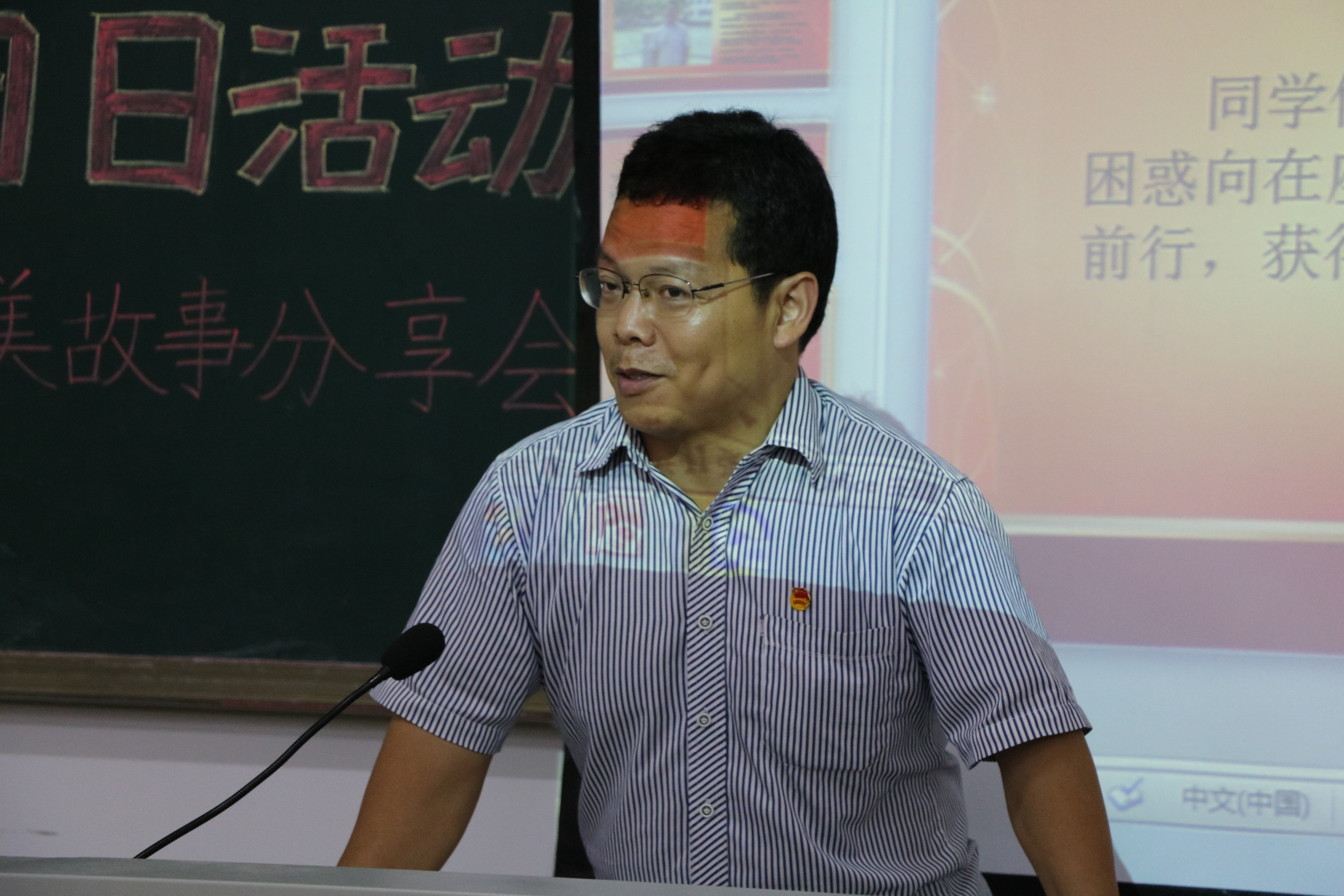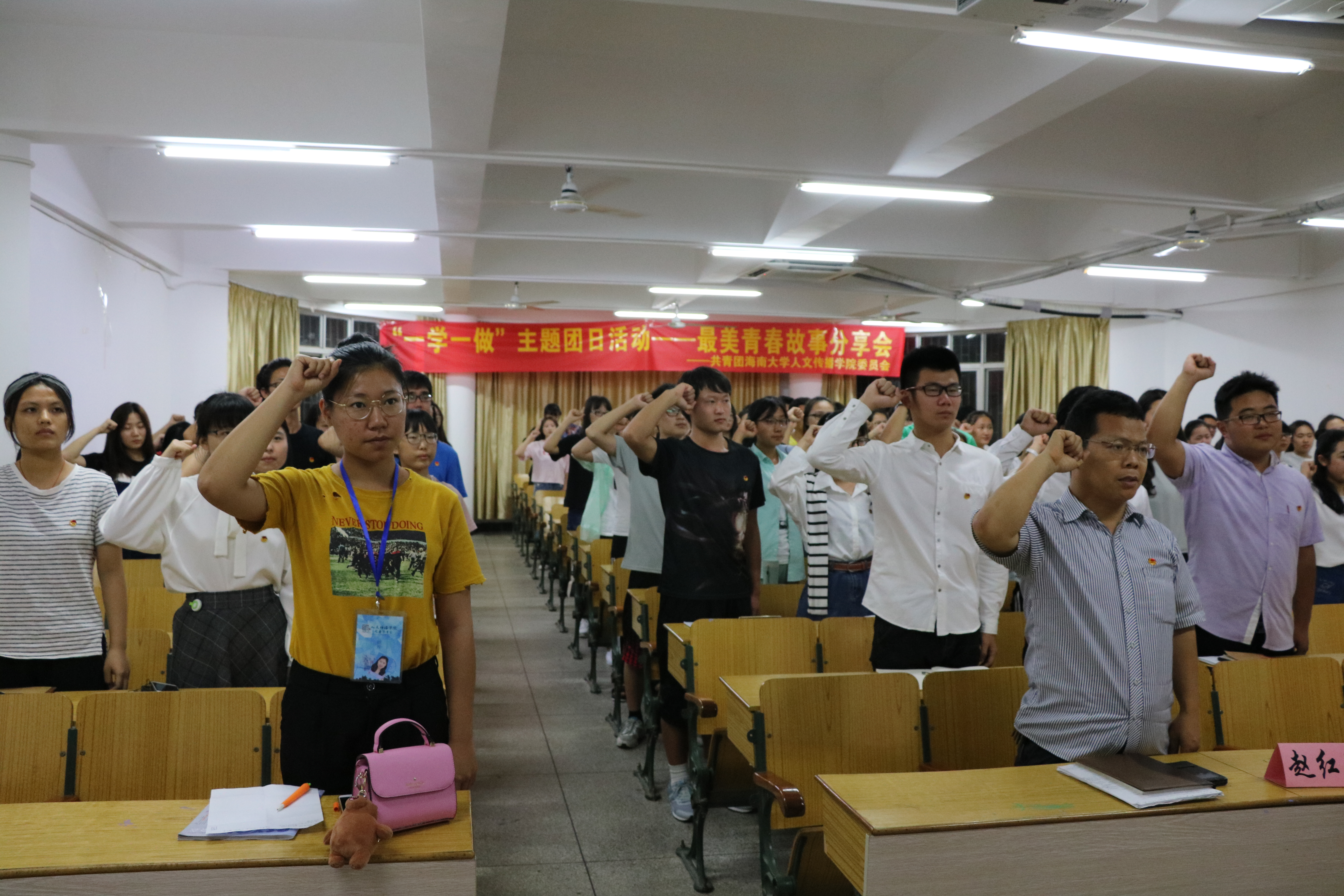 活动在激扬的中国共产主义青年团团歌《五月的花海》中拉开序幕,熊文军老师致开场词并现场领誓,带领现场青年团员重温入团誓词。仪式完毕,在同学们的热烈掌声中,赵红亮老师上台分享自己的“最美青春故事”。他首先向同学们分享了自己在高中时期为理想大学奋斗的艰苦求学路程,并提醒同学们时时刻刻都要有目标,有梦想,并要为之去努力奋斗。紧接着,赵老师向同学们讲述了他大学时期在敬老院和孤儿院做义工的经历。为了能更好地给敬老院和孤儿院的老人和孩子们带去更多的关爱,赵老师自学了中医按摩技术,聋哑儿童心理辅导等知识,给老人和孩子们在身体和心理上带来了更大的帮助。在大四时期,赵老师坚定地选择了到海南最为贫困偏远的山区――白沙黎族自治县南开乡从事长达2年的支教活动。在教育孩子们的同时,赵老师也时刻关切着当地人民的生活状况,为解决当地人民在农作物生产中所遇的问题,他多次返回母校向专家了解相关知识,并对当地的群众进行了技术性的指导。支教之路,道阻且长,赵老师不畏艰苦,热于奉献,坚持初心的精神深深地感染着在场的每一个人。