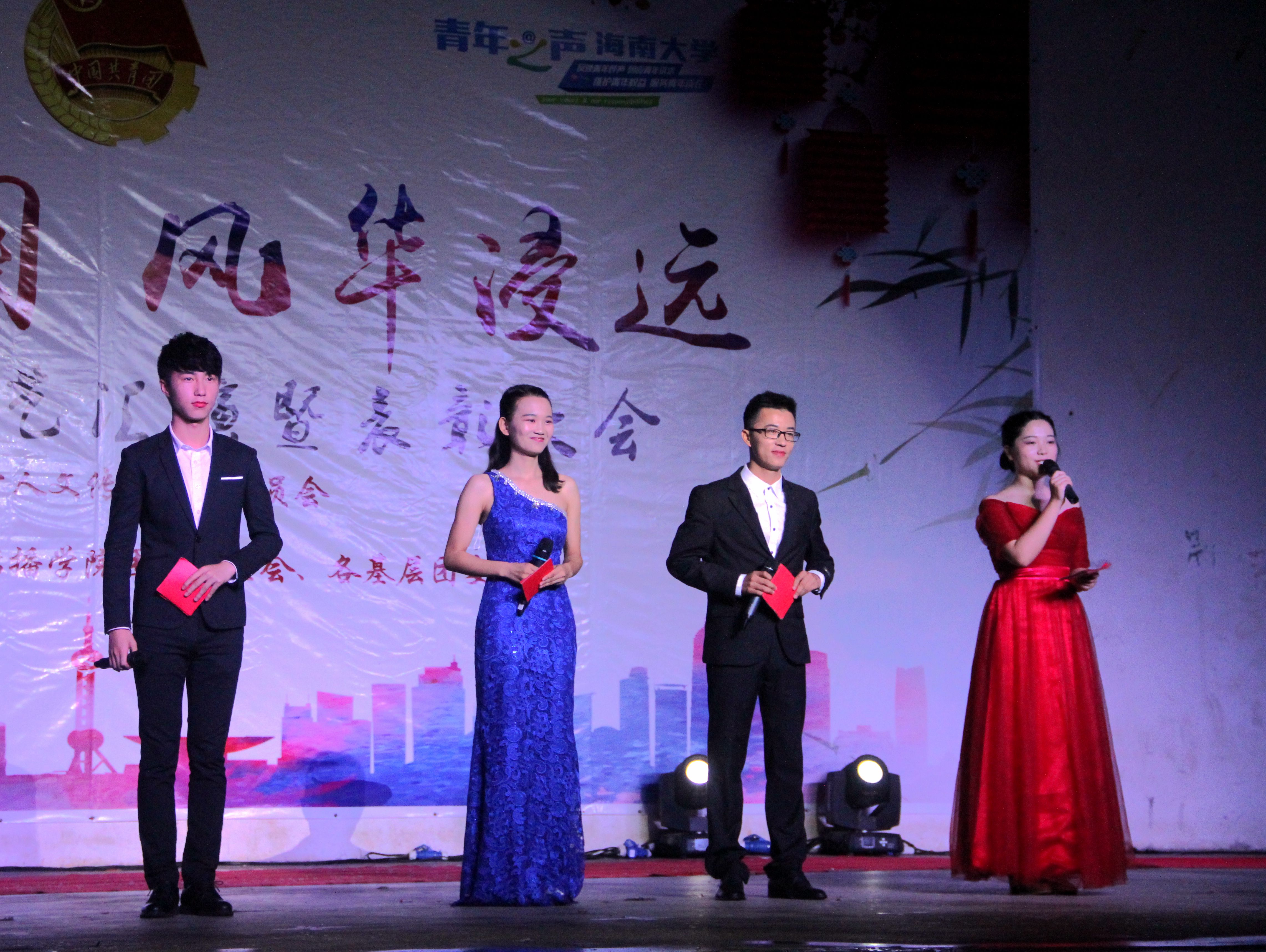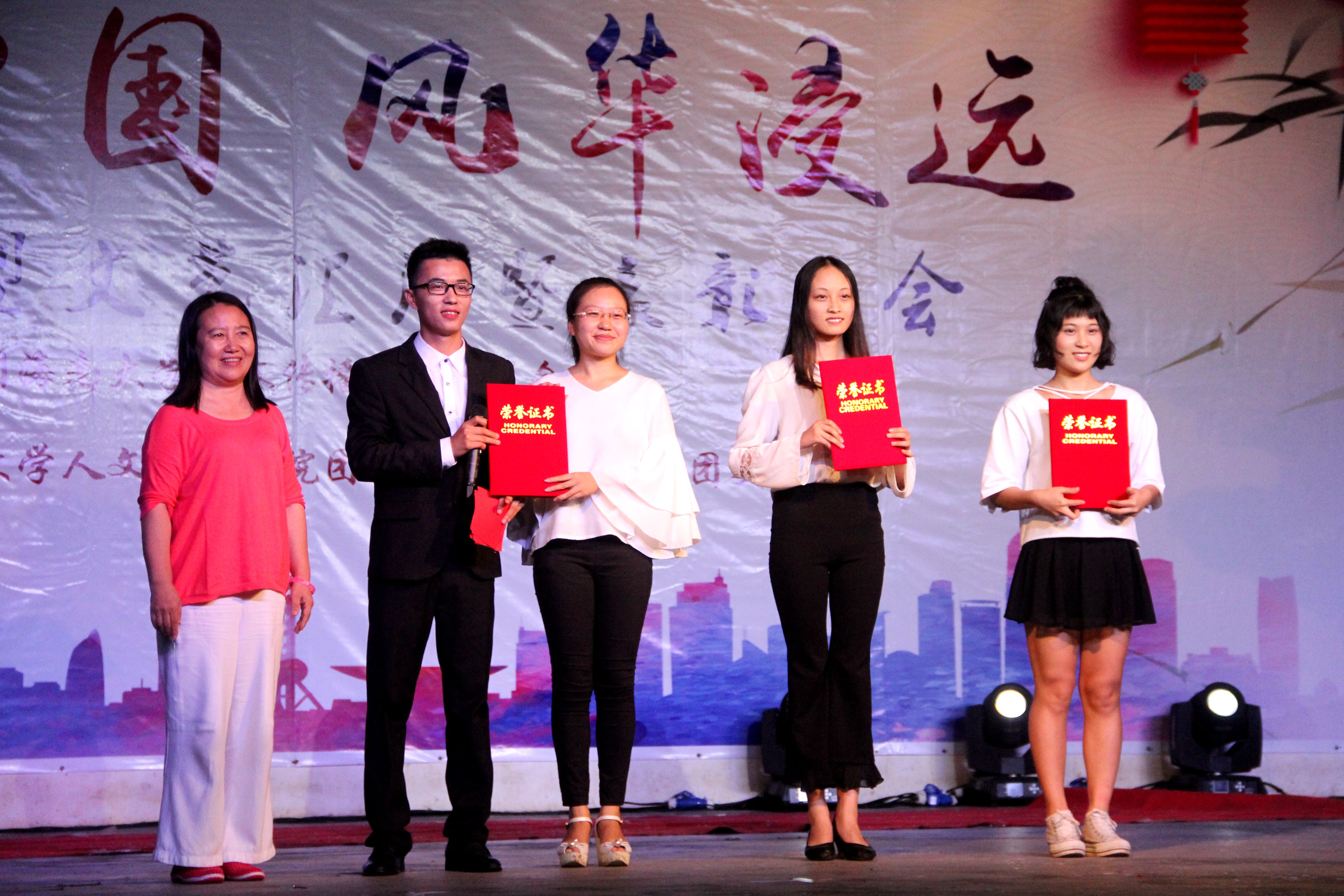 2017年5月20日20:00,人文传播公司“诗词中国,风华浸远”五四文艺汇演暨表彰大会在bevictor1946韦德官网城西校区运动场隆重举行。应邀莅临本次活动的嘉宾有bevictor1946韦德官网人文传播公司党委孙晓媛副书记、汉语国际教育系系主任丛琳老师、汉语言文学系仲冬梅老师、广告系蒋锐老师,戏剧影视文学系汪荣老师,同时出席活动的还有人文传播公司团委书记熊文军老师、学工办王俊延老师、李润东老师。汇演比赛由孙晓媛副书记及各系老师担任评委,整场晚会高潮迭起,互动不断,给在场的观众带来了一场精彩的视听盛宴。