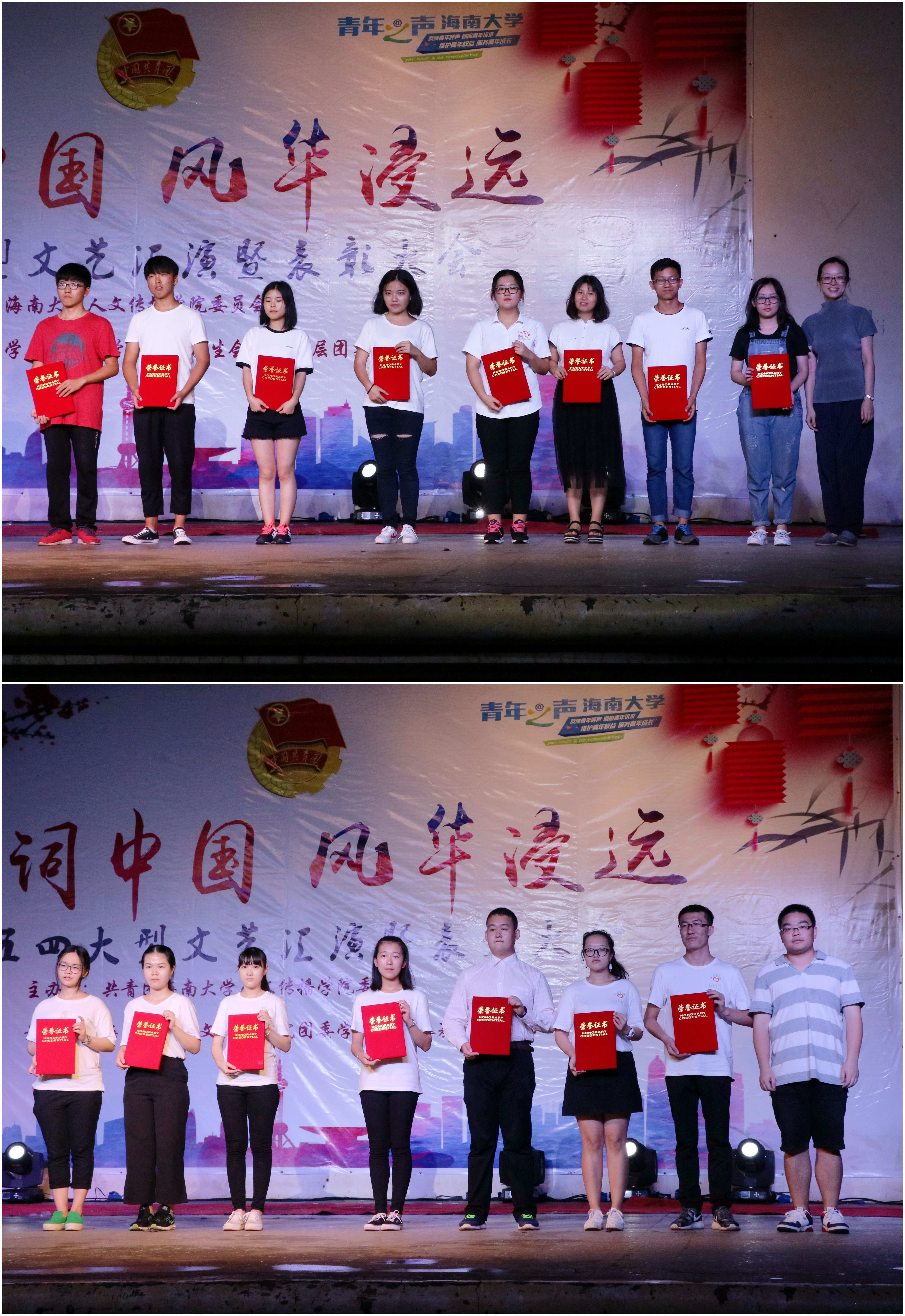 20点整,五四文艺汇演暨表彰大会在国学社以及特邀嘉宾的歌舞串烧的表演中正式拉开帷幕。本次文艺汇演由各年级各专业分别派出一支团队以比赛的形式向观众呈现,由评委进行打分,最终评选出各参赛班级的名次。晚会中,诗与歌舞的巧妙结合,向大家展现了中国诗词的魅力。15级汉语国际教育的同学表演的舞蹈《茉莉花》以整齐的阵容、优美的舞姿引起现场掌声连连。14级汉语国际教育的同学演绎的相声《学富五车》触发了全场的笑点,将古今中外的寓言故事环环相扣,现场欢笑不断。16级中国语言文学类三、四班同学带来的《将进酒》活灵活现的还原了李白、丹丘生、岑夫子三人饮酒作诗的情景,将李白的豪放与浪漫表现得淋漓尽致。16级戏剧影视文学的同学表演的《但愿人长久》将古筝、舞蹈、歌曲、朗诵串烧,碰撞出不一样的花火。最后,伴随着团学青成员带来的歌舞兼朗诵《荡起我们的中国心》,本次文艺汇演表演环节圆满结束。在评委们公平、公正的评分下,比赛结果也在大家的期待中公布。16级中国语言文学类三、四班以本场最高分获得本次汇演一等奖。16级戏剧影视文学、16级新闻传播、15级汉语国际教育凭着优异的成绩获得二等奖,其他各专业表演团队收获三等奖。此外,通过“海大人文青年”平台进行的节目网络投票评选的“最具人气奖”由16级戏剧影视文学获得。