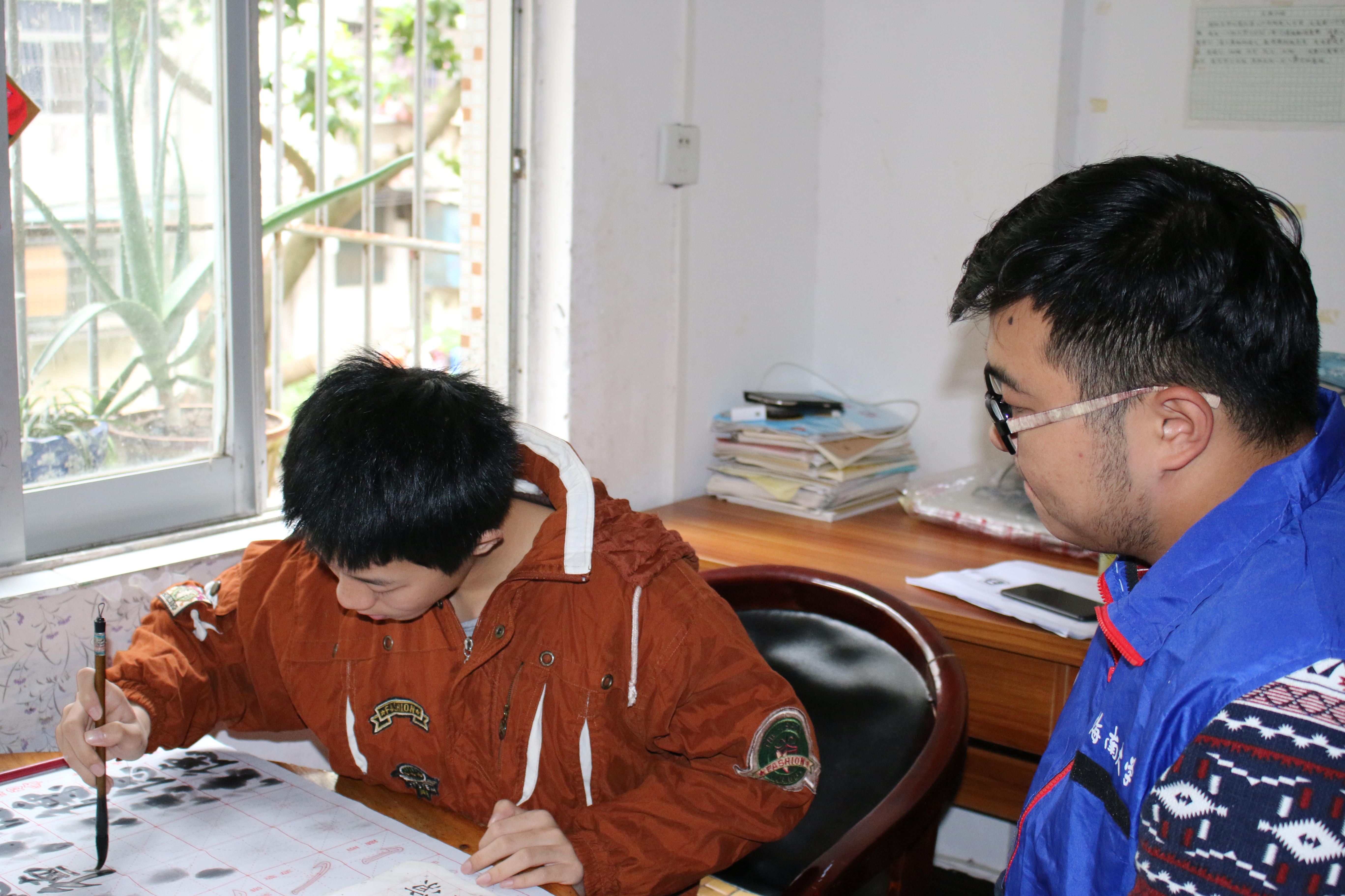 志愿者教授孩子孩子书法