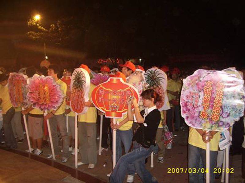 八点整,整个活动正式启动,台上主持人-我们公司的马旭佳、黄艳青两位同学话音未落,台下观众早已把整个广场围了个水泄不通。欢呼声、掌声、叫喊声与音乐一起合成一曲美妙的和谐乐章。随着主持人一声令下,十个花灯队伍按方阵的队列浩浩荡荡地出发了。志愿者们高举着倡议“文明换花”的彩灯,手捧着束束鲜花走向行人中去。台上主持人与观众进行妙趣横生地知识问答游戏,笑料百出,其乐无穷。幸运观众答对问题还可以获得一只鲜花得到一份祝福并能享受免费海口一日游。整个活动高潮迭起,台下观众个个摩拳擦掌跃跃欲试。直到我们的活动宣告结束依然有许多观众久久不愿离去,还有一些好奇的群众仍然向我们的广场走来看个究竟。