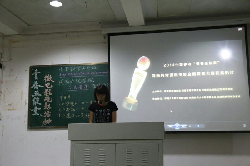2014年10月19日晚7:30,以“汲取青春正能量,践行社会主义核心价值观”为主题团日活动——“青春正能量”微电影观影展映在城西校区教学楼二楼C01成功举办。本次活动由人文传播公司团委宣传部承办,人文传播公司2014级全体新生共同参加。