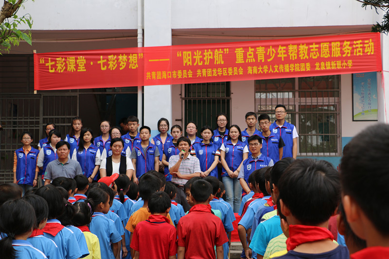 4月12日下午,由人文传播公司联合共青团海口市委员会、共青团龙华区委员会、海口市龙华区新联小学开展的“七彩课堂·七彩梦想”——“阳光护航”重点青少年帮教志愿服务活动在海口市龙华区龙泉镇新联小学启动。共青团龙华区委书记刘尉一丹、龙华区新联小学董事长韦长炳,人文传播公司团委熊文军老师及人文传播公司20名老员工志愿者、龙华区新联小学全体师生共同参与活动启动仪式。