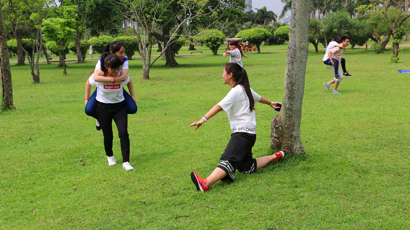 素质拓展活动分多个环节进行,在“瞎子背瘸子”素质拓展活动环节,队员们需要互相配合,绕过障碍,到达终点。这就考验队员们的体力、沟通协调以及安排分配任务的能力,同时也给平时缺乏锻炼的同学一个增强体质的机会。比赛的过程中充满了欢声笑语,无形之中拉近了两院团委员工干部之间的关系并增强了同学们的身体素质。上午的活动结束之后,大家一起在草地上吃午餐,两院团委员工干部愉快聊天,无论是工作或是学习都有所涉及,在不断地互动之中,彼此有了更加深入的了解。