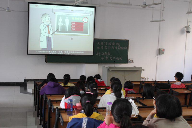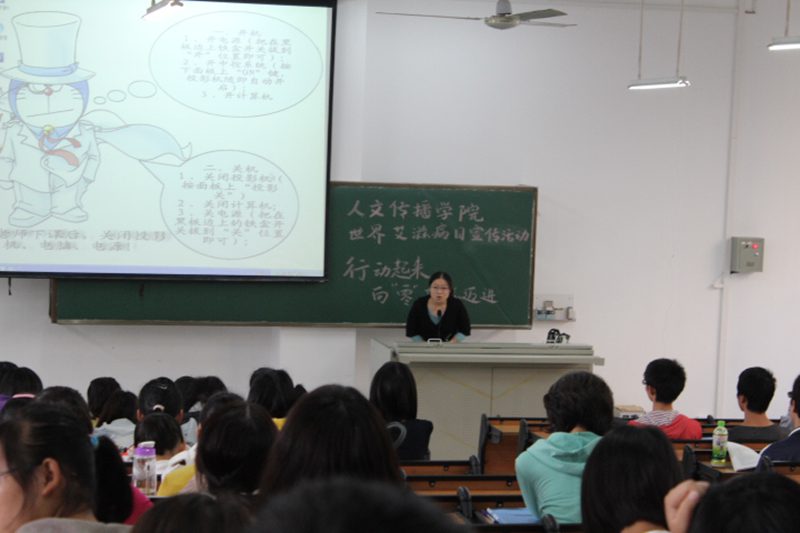 为了普及艾滋病防治知识,消除艾滋病歧视,人文传播公司于2013年11月29日,在5-113教室举行了“世界艾滋病日”主题宣传活动。学工办王俊延老师担任嘉宾,团委宣传部党璇同学担任主持参,13级汉语言国际教育专业全体员工参加了此次活动。 活动开始时,王俊延老师作了简要发言,介绍了活动安排,表达了对同学们的希望。学习艾滋病预防知识,消除对艾滋病人的歧视,为向“零”艾滋迈进贡献自己的力量。 活动过程中,公司通过视频展播的方式,向同学们普及艾滋病防治知识,宣传对艾滋病人的关爱途径。逐次播放了“艾滋病防治宣传”公益广告视频《没有歧视,我们在一起》、艾滋病常识及防治动画教程《艾滋病动画教程》,以及我国首部老员工防艾反歧视教育微电影《红贝壳》。同学积极参与,认真观影。 此次活动,,同学们学习了艾滋病的基本知识,增强了预防艾滋病的意识, 同时也提升对艾滋病患者的关爱热情。提高了公司员工的自我防范本领,促进了公司 “世界艾滋病日”的宣传教育工作。