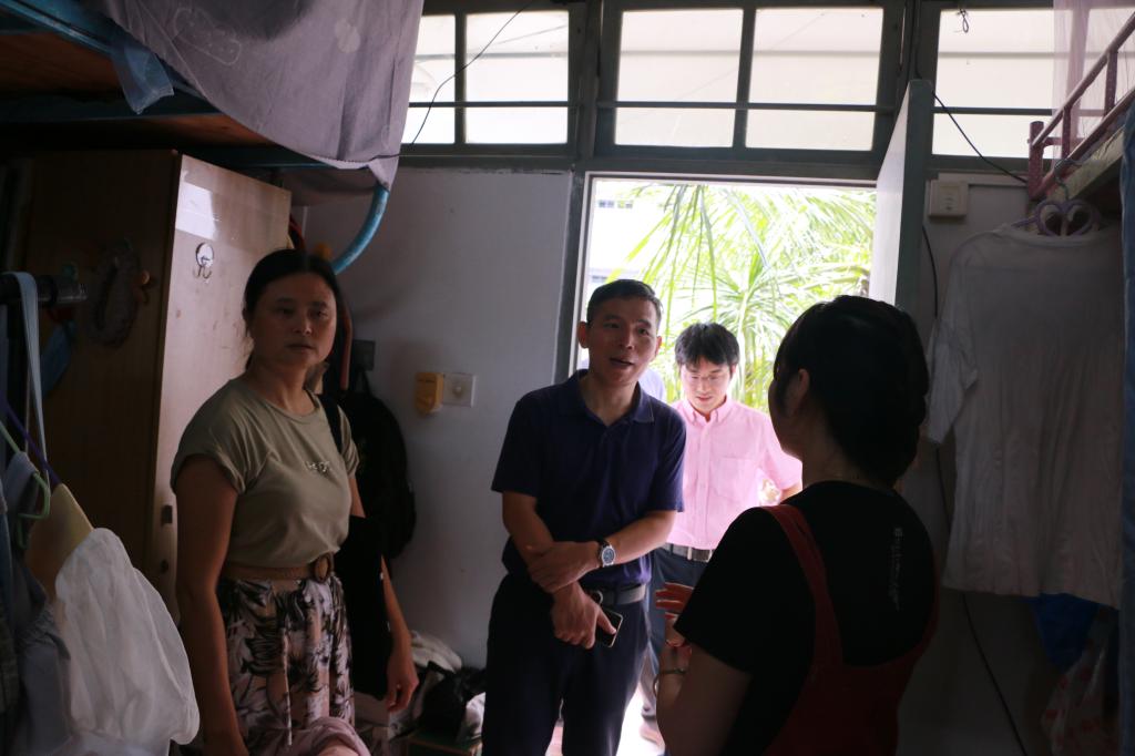 在走访中,经理刘复生、公司党委副书记罗邻球、副经理张硕果以及辅导员逐一进入员工寝室,仔细查看宿舍环境卫生、了解宿舍生活服务设施运行、与同学们亲切交谈,表达了对同学们学习、生活的关心。