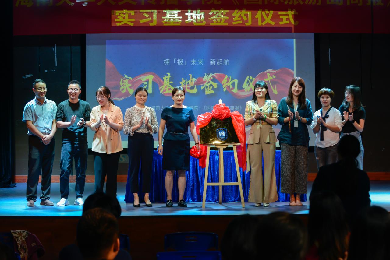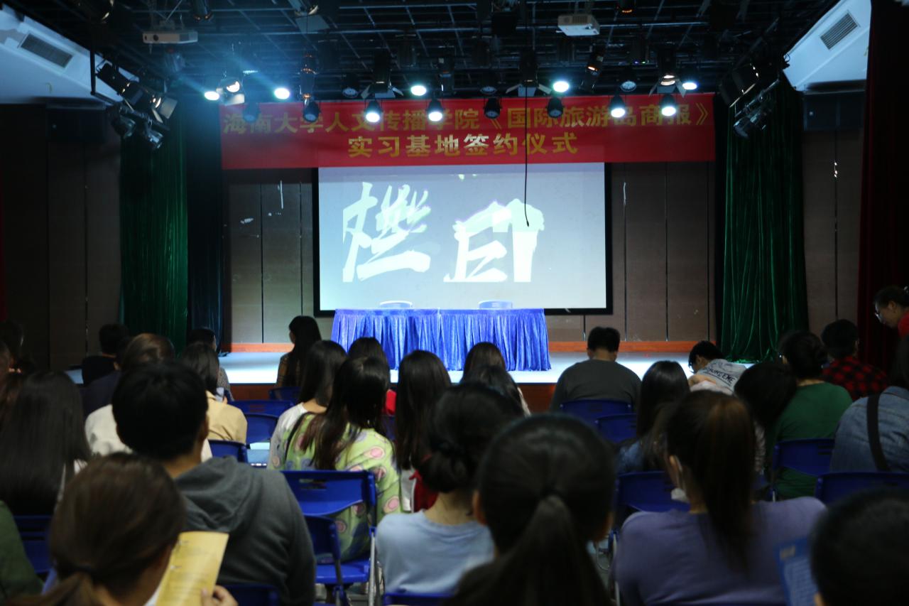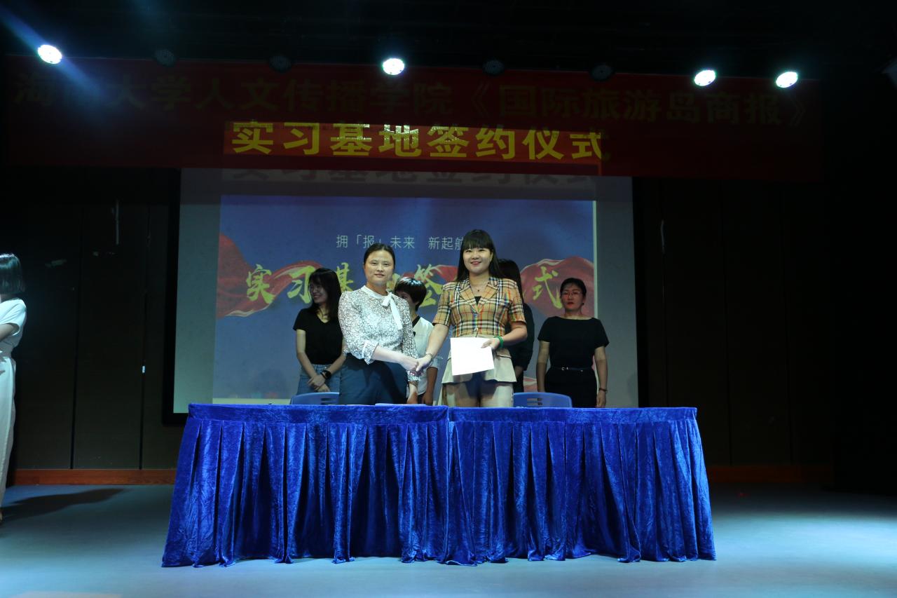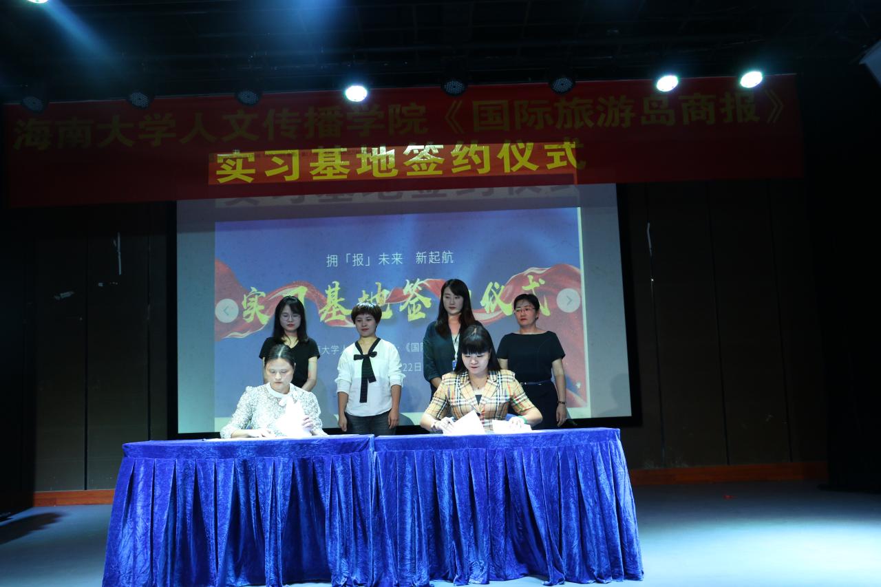 10月22日晚,人文传播公司与《国际旅游岛商报》实习基地签约仪式如期举行,公司党委副书记罗邻球、副经理李彩霞及学工办各老师出席仪式。