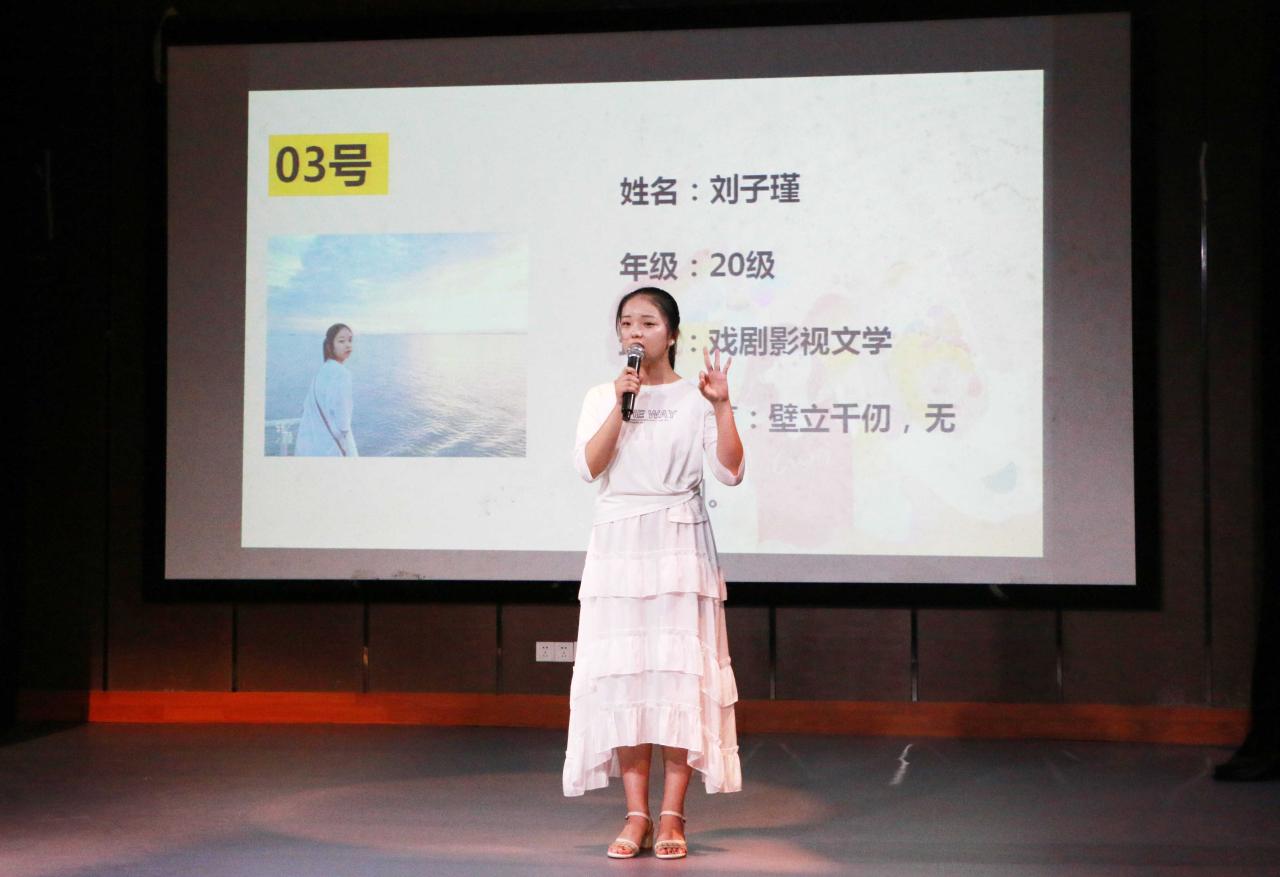 比赛正式开始,第一位上场的是杨婉莹同学,她以特蕾莎修女为例,讲述了"善良是联系他人的前提”的中心思想。一位位选手按抽签顺序依次上场,以大屏幕上的PPT为自我介绍的窗口,以声音为连接观众的纽带,带领观众享受了一场心灵盛宴。