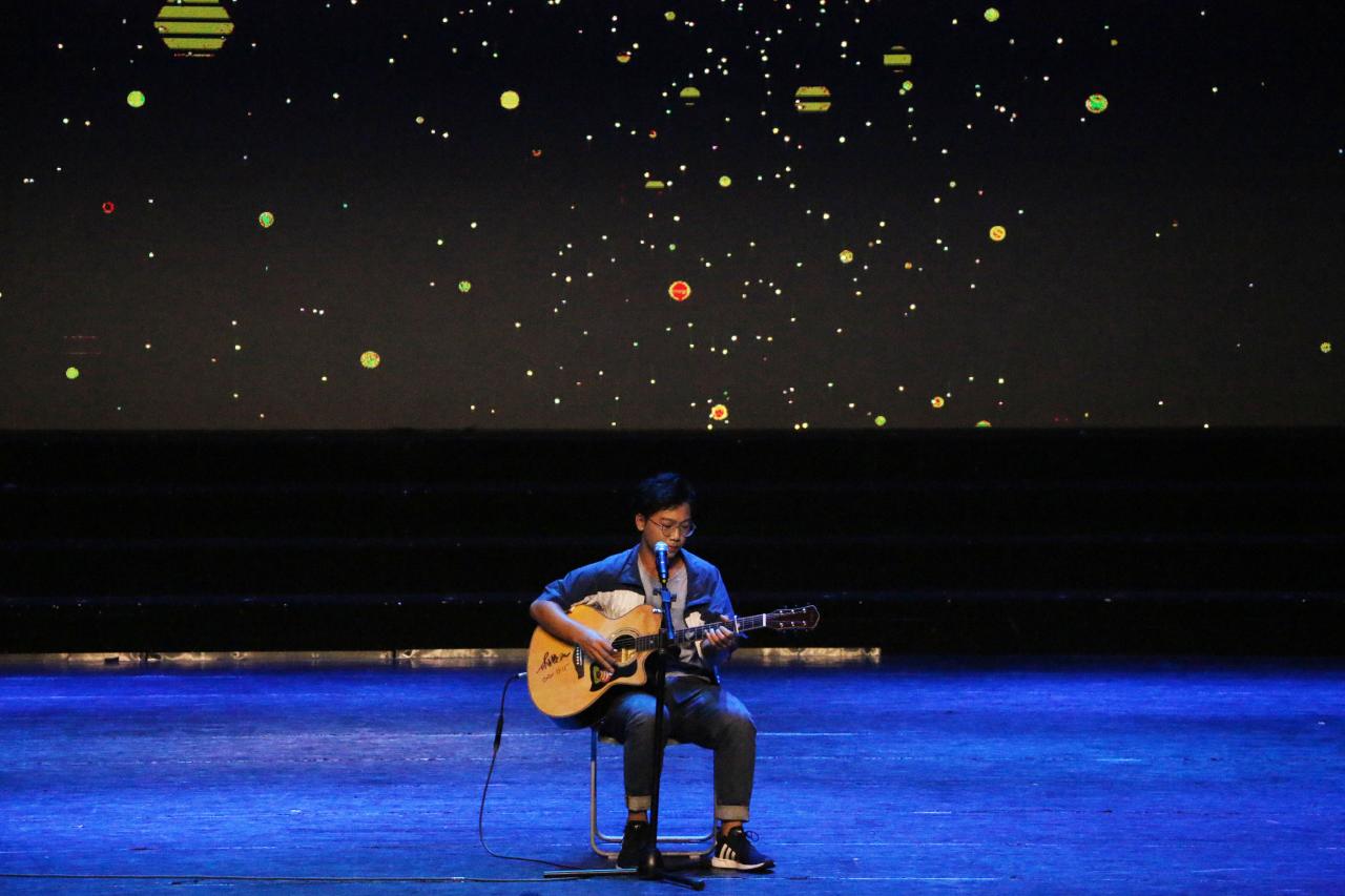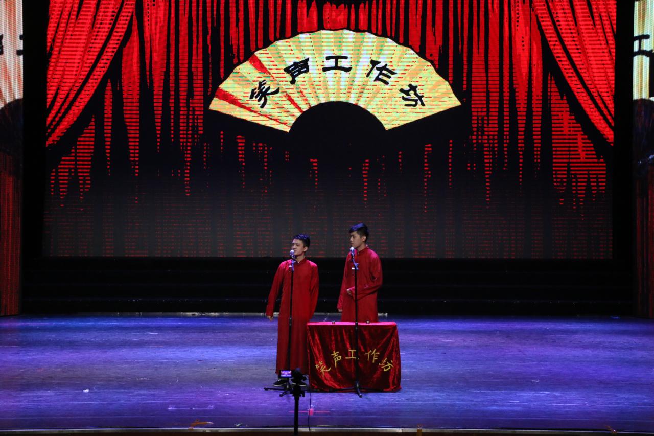 抽奖过后,一支性感大胆的韩风舞蹈《latata》把观众们拉入了第二个篇章“小岛罗曼史”。乘着舞蹈浓烈的余韵,一曲由吉他社陈涛带来的吉他弹唱《故乡》则似一汪清冽的泉水,挟着流年慢慢流淌。同学们纷纷打开了手机的闪光灯,随着旋律摇晃手臂,跟随着歌声摇曳进入思乡情切的星海。随着笑声工作坊的登场,全场的气氛再次轻松欢愉了起来。相声《打灯谜》让同学们彼此会心一笑,拍手称赞。