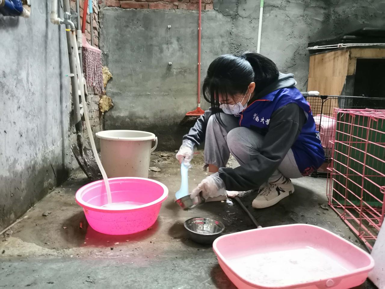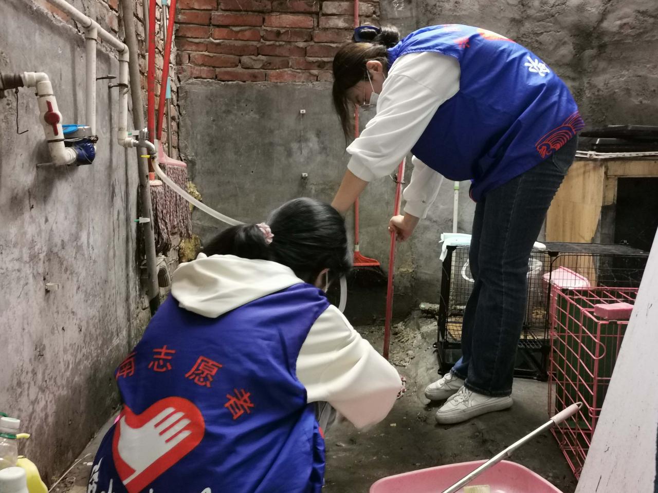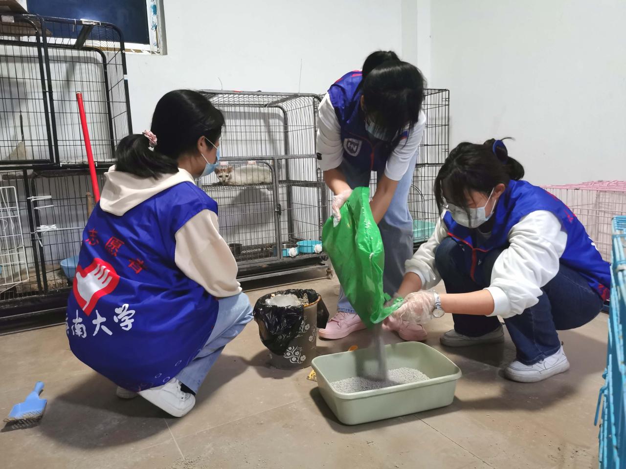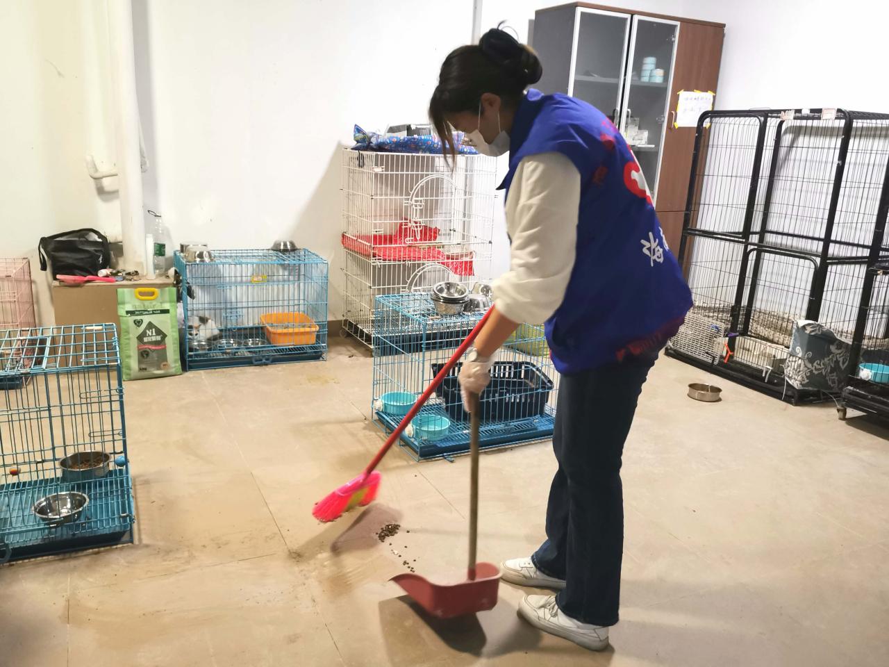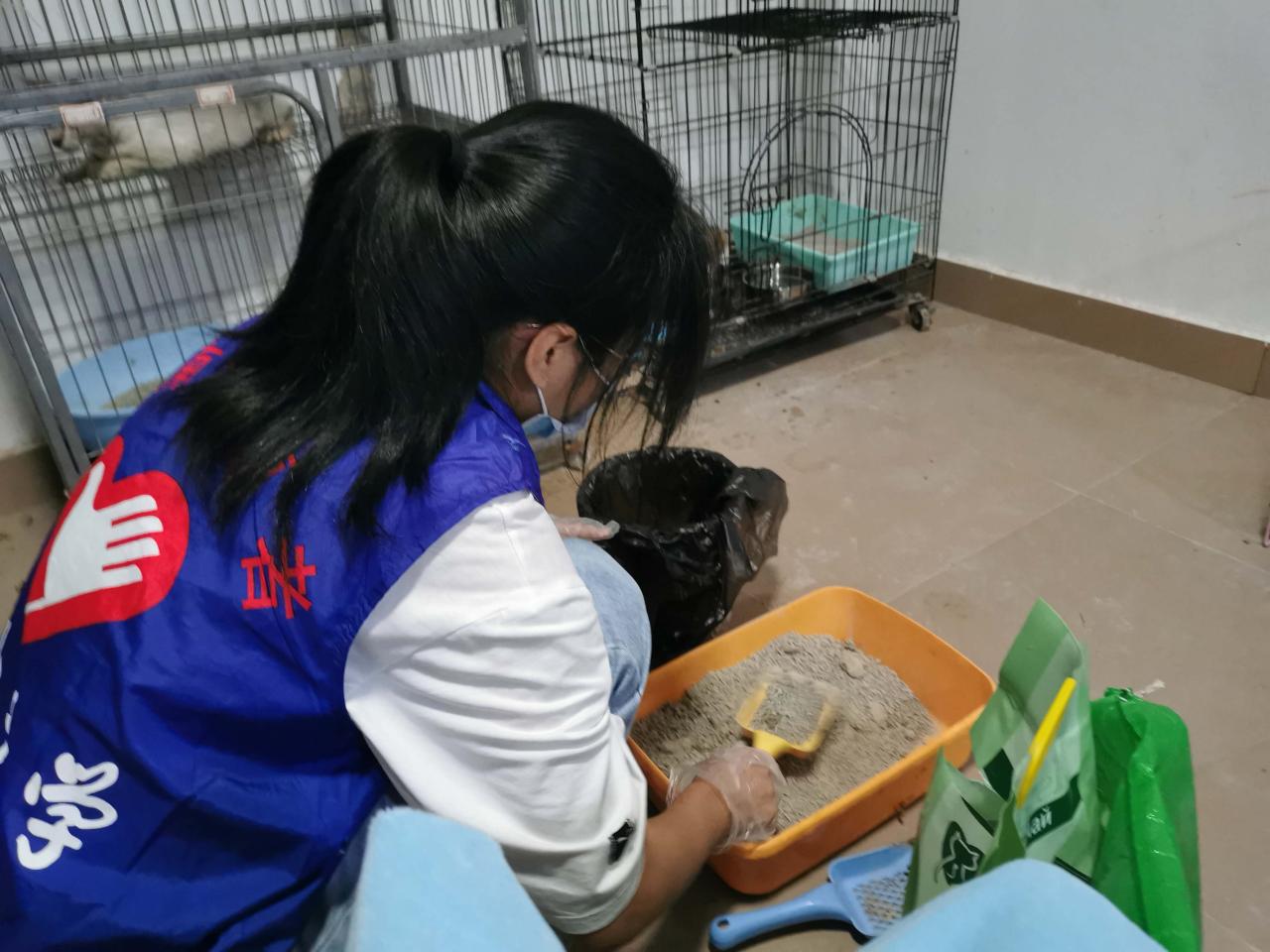 活动期间,志愿者分为三组,分别进行打扫场地、清理猫粪便、喂食喂水的工作。活动初次开展,流浪猫收容所的环境卫生较为一般,负责打扫场地的志愿者不放过任何一个卫生死角,将地上的猫毛、猫砂等垃圾都打扫干净,提高猫咪的生活环境质量。猫的粪便有特殊气味,需要定期清理。负责清理猫粪便的志愿者蹲在猫砂盆面前,用专门的小铲子清理猫粪便,再小心倒入猫砂。而负责给猫喂食喂水的志愿者则用刷子清洗干净猫碗,然后添加猫粮,更换饮用水。志愿者们分工明确,活动进行得井然有序。