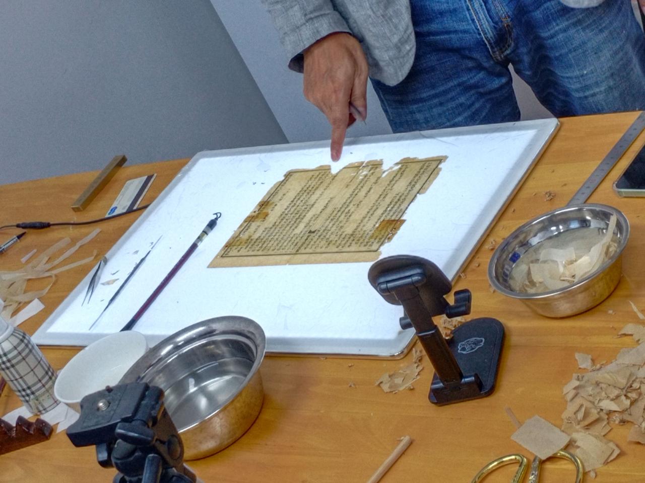 介绍完毕后,志愿者们前往古籍修复室学习如何保护、修复古籍。黄老师向志愿者们展示古籍修复工具,详细讲解了古籍修复的步骤,向志愿者们演示如何将纸张对折、对齐,并且拿出往期员工的印刷作品供志愿者们学习。在此次活动的最后,志愿者们积极提问,黄老师耐心地解答关于古籍修复方面的专业问题,志愿者们收获颇丰。