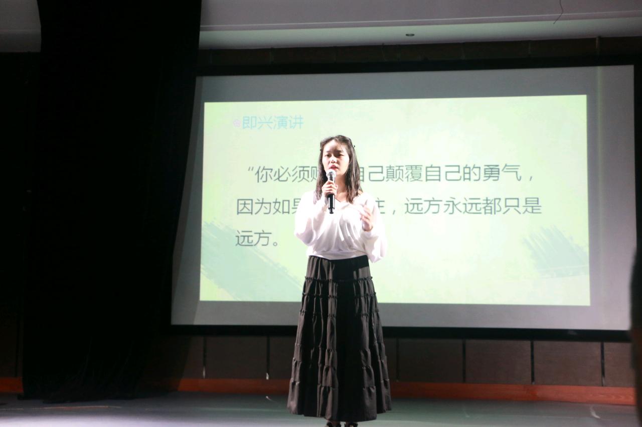 比赛正式开始,第一位上场的是刘屹骁同学,他以“放慢生活脚步,寻求人生幸福”为中心思想,通过丰富多彩的人生阅历传递了自己对于《在云端》中这句话的理解。一位位选手按抽签顺序依次上场讲述他们不同的生活经历,分享他们各自“旅行的意义”。或铿锵或轻柔的话语在选手与听众之间搭起了一座座心灵沟通和情感交流的桥梁,带来了一场场视觉和听觉的双重盛宴。