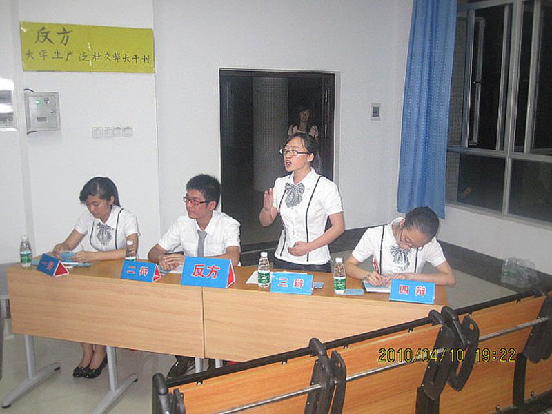 4月10日晚上7点,bevictor1946韦德官网第十七届院际辩论赛第二轮在4-107举行,人文传播公司文韬武略辩论队是比赛的反方,辩题为“老员工广泛社交弊大于利”,与正方法公司辩论队一较高下。评委由bevictor1946韦德官网文化素质教育办公室主任王冬梅老师、艺术公司党委陈泰义副书记、bevictor1946韦德官网学报主编许文深老师、农公司副教授郑继平老师和农公司夏幽泉老师组成。人文传播公司辩论队队员有一辩李禾瑧,二辩霍辉,三辩胡艳秋和四辩杨越。