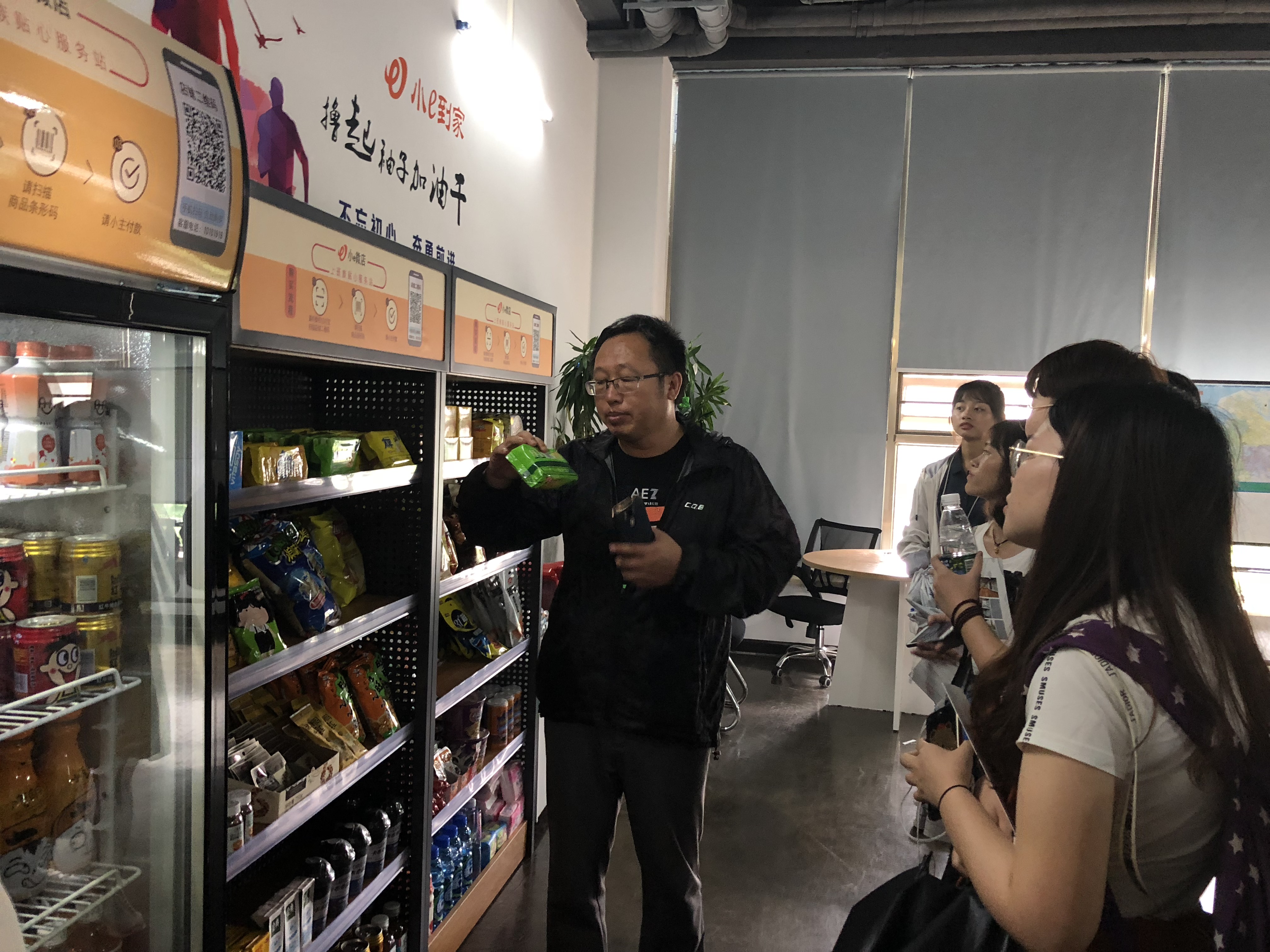 紧接着王淑玲专员带领大家参观了复兴城其他几处创新创业孵化基地,帮助同学们了解更多创新企业及开发的项目。在小e微店,负责人陈总向同学们介绍了开放式自动售货机这一新型零售商品模式以及背后所蕴含的营销理念,同学们对产品产生了浓厚的兴趣,纷纷拿起手机扫码体验购物过程。之后同学们来到海南蘑菇头网络科技有限公司,这是一家致力于为游戏玩家提供优质虚拟增值服务的电子商务平台,一家专业从事网络游戏装备、账号、金币、点卡等虚拟物品交易的电子商务网站。光谷创业咖啡海南区域运营负责人梁波为同学们介绍了入驻企业的基本情况,进一步丰富了同学们对创业公司的了解。