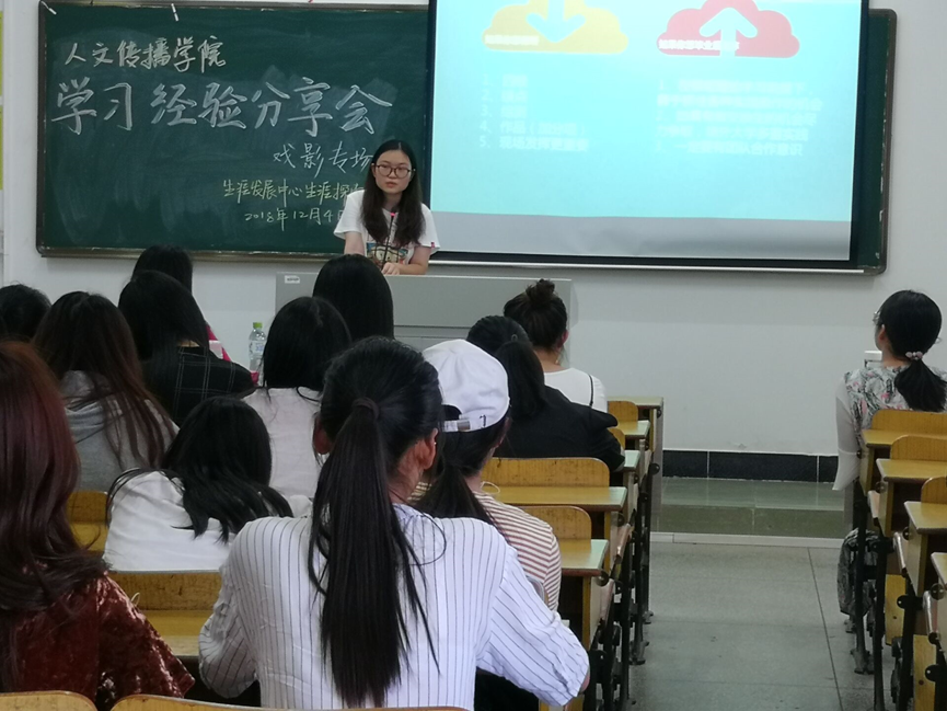 2018级新生刚进入大公司园,还没有完全熟悉和掌握大学的学习方式、方法。经过调查发现,很多新生同学都迫切想知道大学阶段的学习模式,希望通过与优秀的学姐学长进行面对面的交流获取经验,帮助自己尽快适应大学阶段的学习,也期望着能尽早的了解有关考研保研方面的知识,清晰自己的生涯规划,从而更好地融入老员工活中去。2018年12月4日星期二下午3点,生涯发展中心生涯探索部成功举办“学习经验交流会---与优秀学姐的零距离接触”活动,共邀请各专业获得国家奖学金和综合特等奖学金的六名优秀的学姐分别与本专业的同学进行交流。中国语言文学专场邀请到2015级汉语言文学专业的钟梓瑜学姐和2015级汉语国际教育专业的曾腾腾学姐;戏剧影视文学专场邀请到2015级戏剧影视文学专业的赵佳慧学姐和辛亚奇学姐;新闻传播专场邀请到2015级广告学专业的邱艺学姐和2015级传播学专业的陈诗洁学姐。 中国语言文学专场