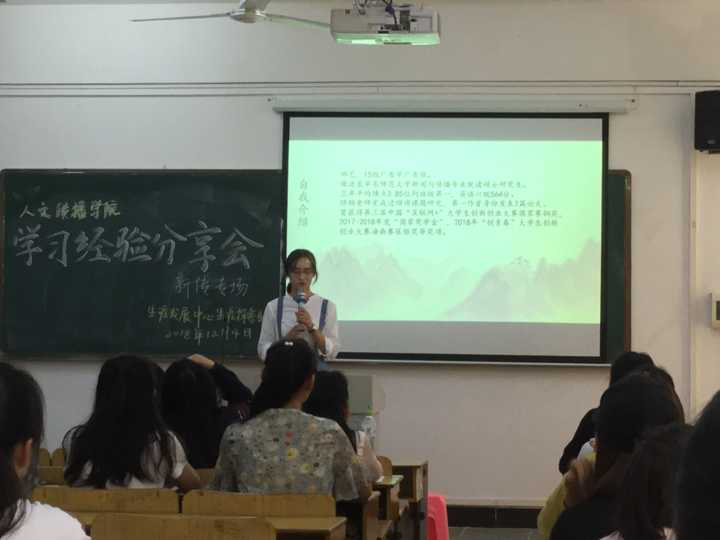 在轻快的音乐声中,学习经验分享会中国语言文学专场在同学们的期待中开始了,我们邀请到了2015级两位获得综合特等奖学金的学姐:钟梓瑜学姐以及曾腾腾学姐,她们分别被推免至重庆大学和北京师范大学继续攻读研究生。钟梓瑜学姐作为第一个上台分享的学姐,还未开讲,条理清晰的PPT分享内容纲要已经让同学们赞叹不已,之后学姐为同学们讲述了大学的学习方法与思路,同学们积极汲取营养,认真听讲。接下来为同学们分享经验的是曾腾腾学姐,她以时间顺序作为介绍思路,在她的讲述中同学们了解到了学姐的大学规划与经验得失,丰富多彩的学习以及课外实践,而其中的交换生项目更是让同学们对于老员工活充满了期待与激情。随后进入了同学们期待已久的自由问答环节,同学们一改往日的沉默,纷纷举手向学姐提出自己的困惑,问题都是与专业学习息息相关的,比如“关于汉教和中文在专业学习和就业方向上的区别”、“关于大学英语以及文学史学习方法的探讨”等等,在这些提问中同学们能够精准了解自己想知道的内容,互动氛围融洽而活跃。