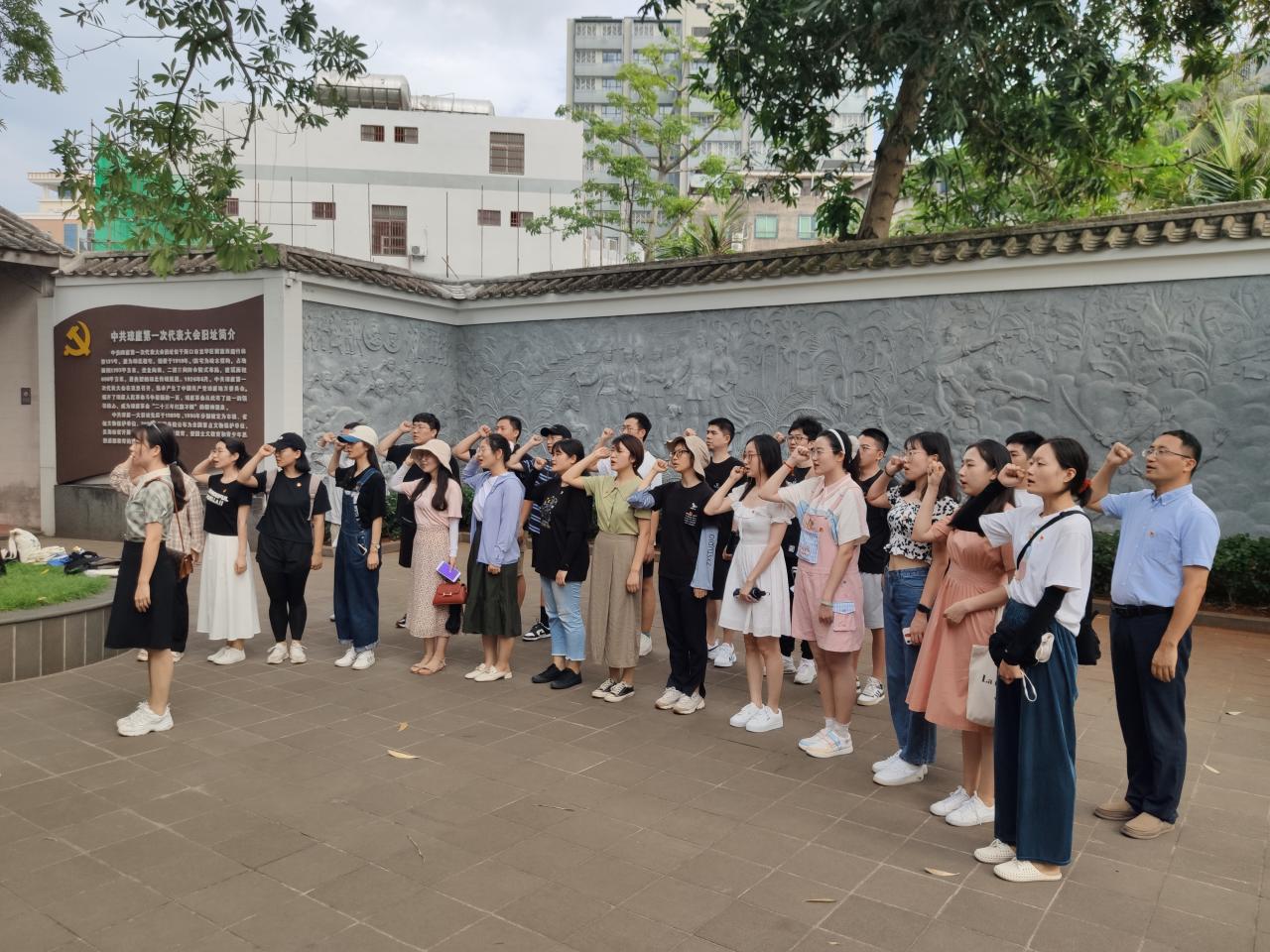 研究生第一、第二党支部全体党员同志参观了中共琼崖一大旧址各史料展厅。讲解员为大家介绍了杨善集、王文明等13位中共琼崖一大代表的生平事迹、中国共产党在琼崖革命“二十三年红旗不倒”的事迹和精神。参观完毕后,全体党员同志面向党旗庄严宣誓。