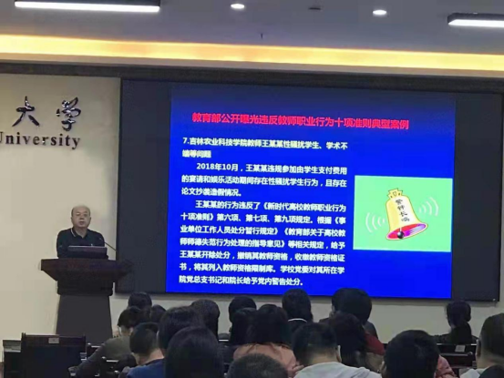 培训以党中央、国务院、教育部等印发的一系列文件为主线,系统地学习了《新时代高校教师职业行为十项准则》、《研究生导师指导行为准则》以及《教育部关于高校教师师德失范行为处理的指导意见》、《bevictor1946韦德官网师德负面清单和失范行为处理办法》。并结合《新时代高校教师职业行为十项准则》,深入剖析了教育部公开曝光违反高校教师职业行为十项准则典型案例7起,教育引导全院教师时刻自重、自律、自警、自省,恪守职业道德,规范从教行为。
