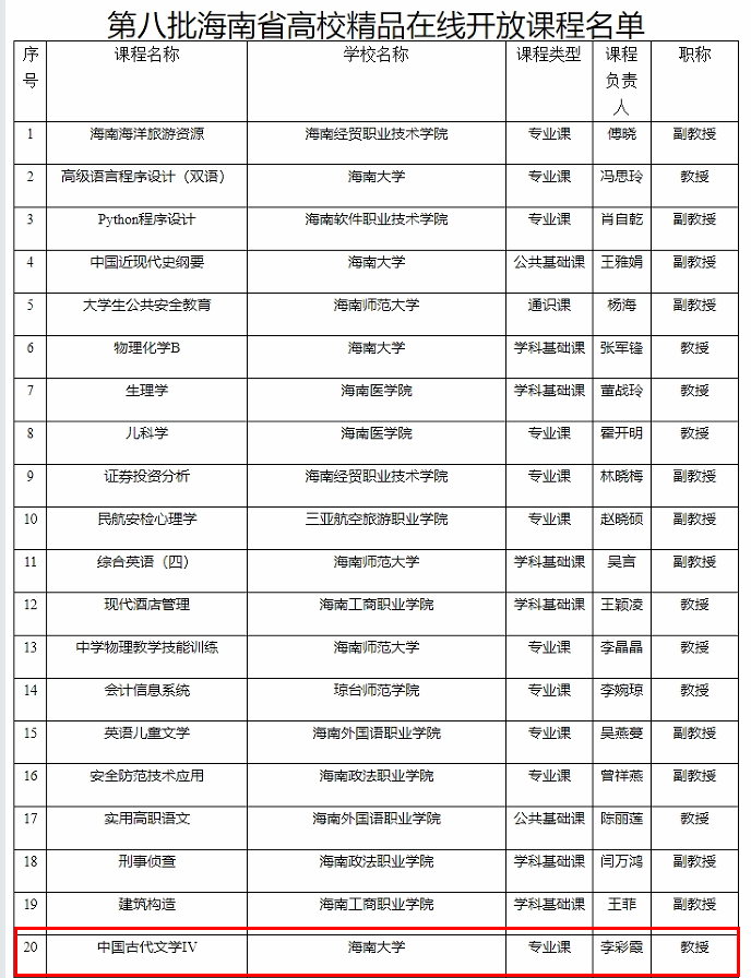 李彩霞教授《中国古代文学IV》入选第八批海南省高校精品在线开放课程